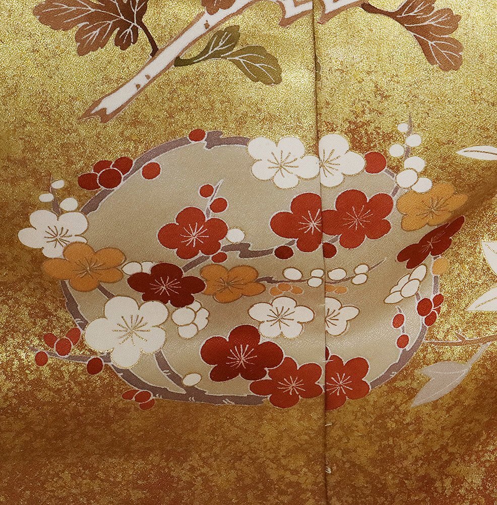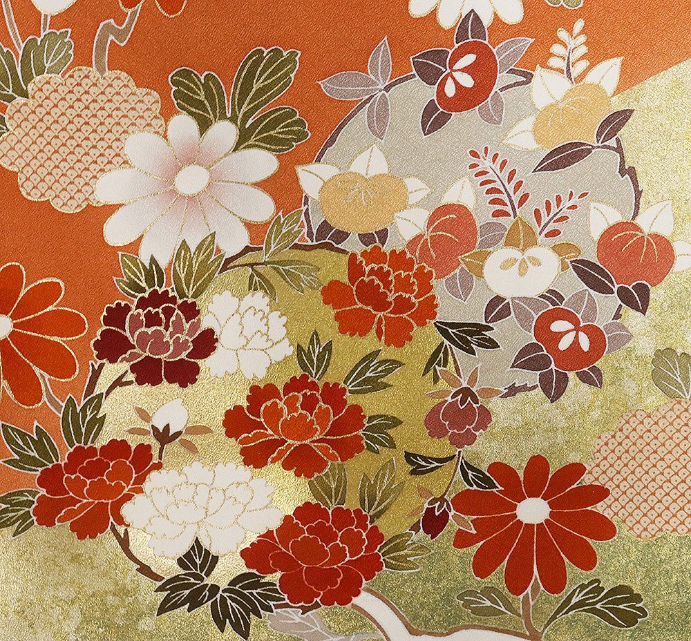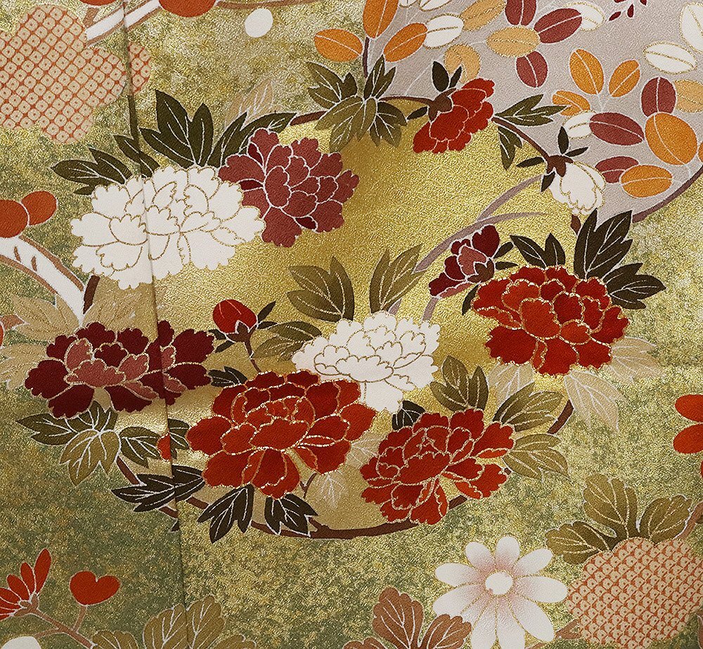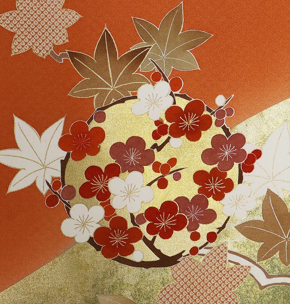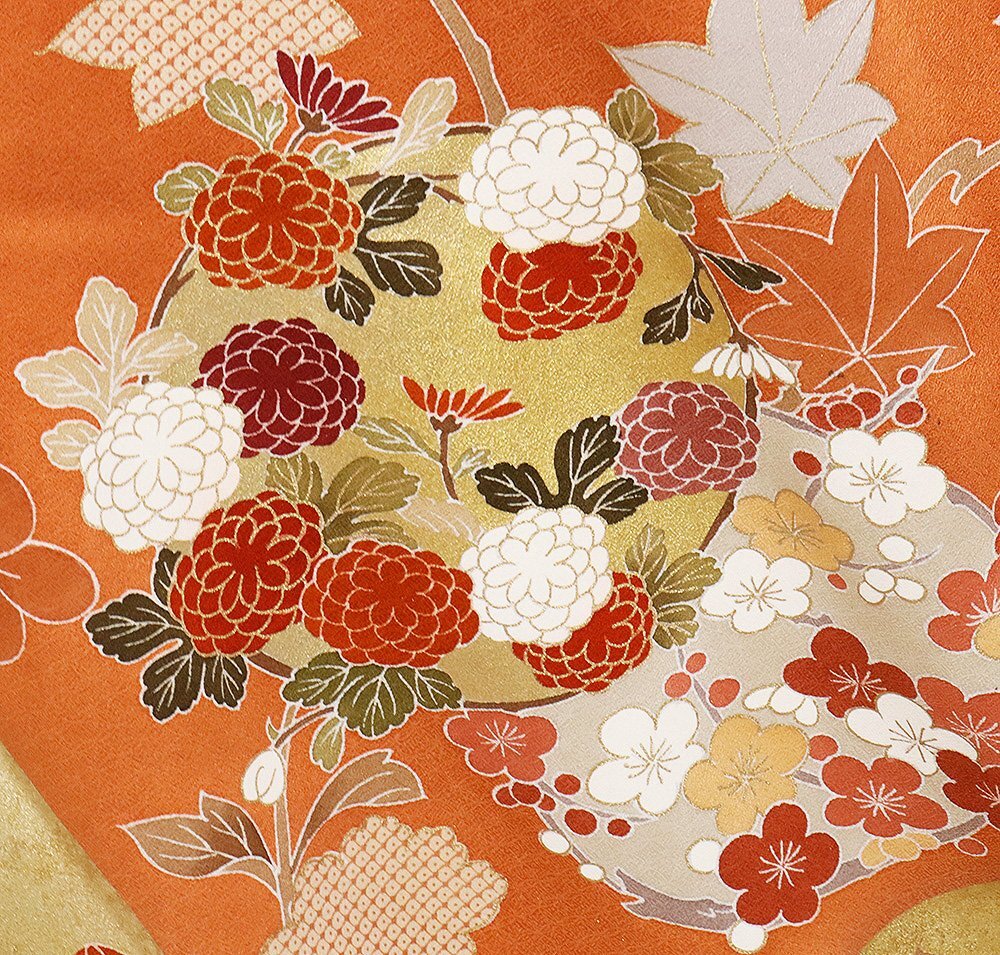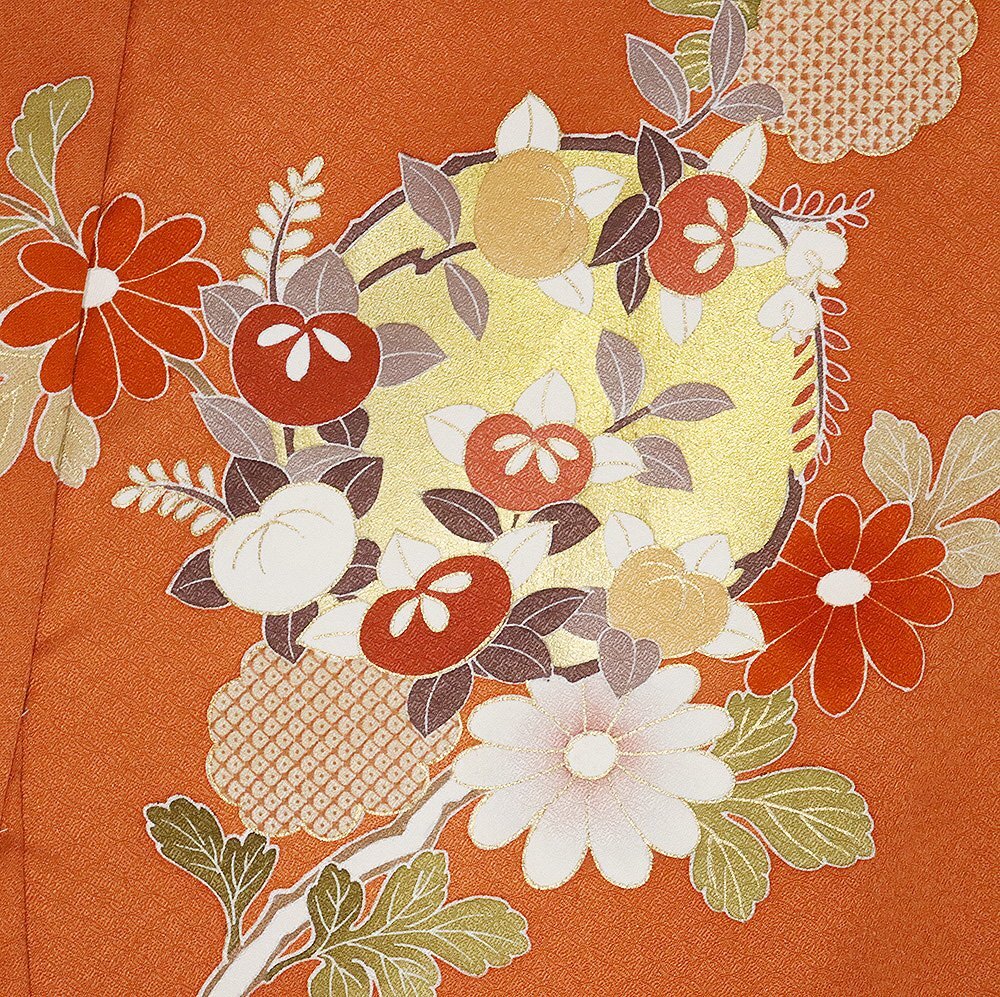 | 色・柄 | 仮絵羽 訪問着 丹後縮緬地 レンガ色・金箔・暈し地 花丸文 (写真では上手く色が出ない場合があります。ご了承下さい) |
