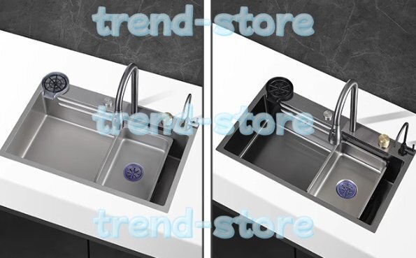 大型キッチンシンク 304ステンレスウォーターフォールシンク台所シングルシンクブラックシンクセット引き出し式蛇口付き80x45cm