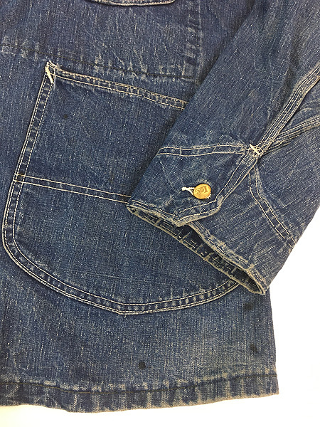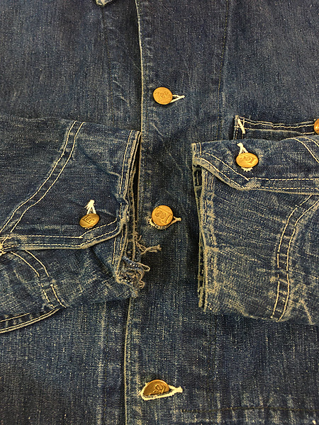 濃紺インディゴ ジェルトデニム・ピスネーム R.MRなし・斜体eロングLボタン・裾ポケット内側当て布・左胸ポケット内ペン差し。