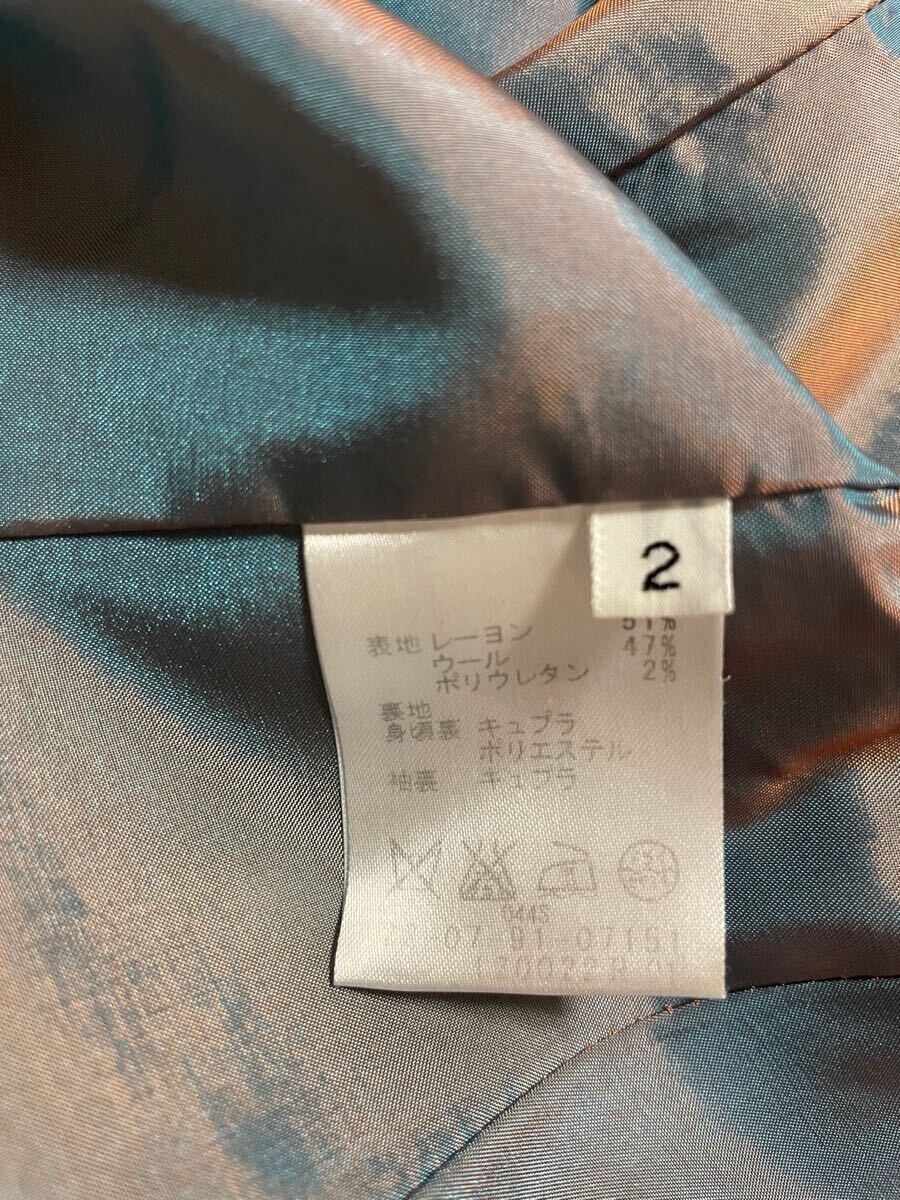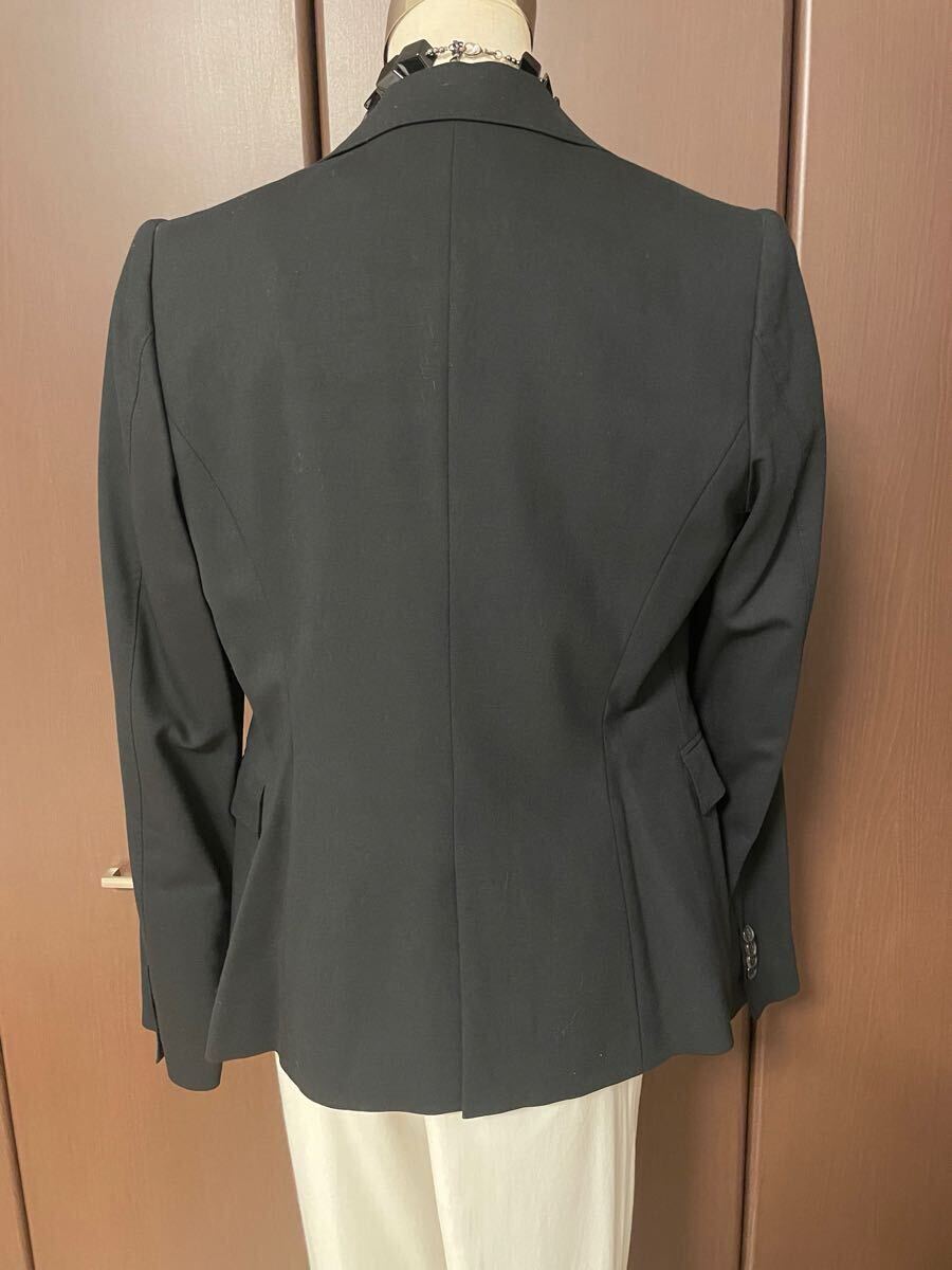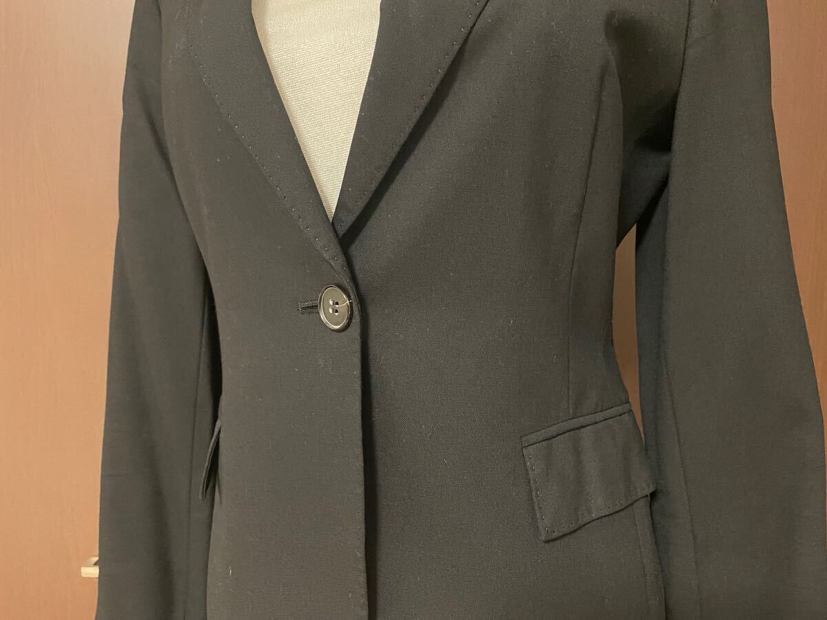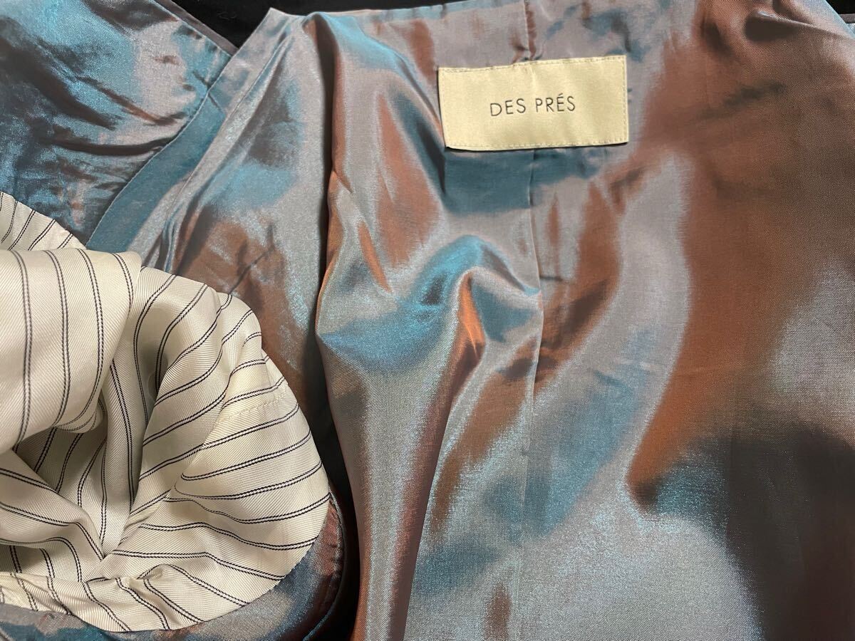 デプレ DES PRES のテーラードジャケットです。黒色。素材は、レーヨン・ウール・ポリウレタン。サイズ2、9号くらい。幅約39㎝、丈約マエ60・ウシロ56㎝。前ボタン1つ。袖ボタン4つ。前側両サイドポケット。後ろベンツ。テカリや擦れ、内側に若干汚れ箇所あり、気になる方はご遠慮ください。商品以外のアクセサリー・インナー・ボトムは含まれません。