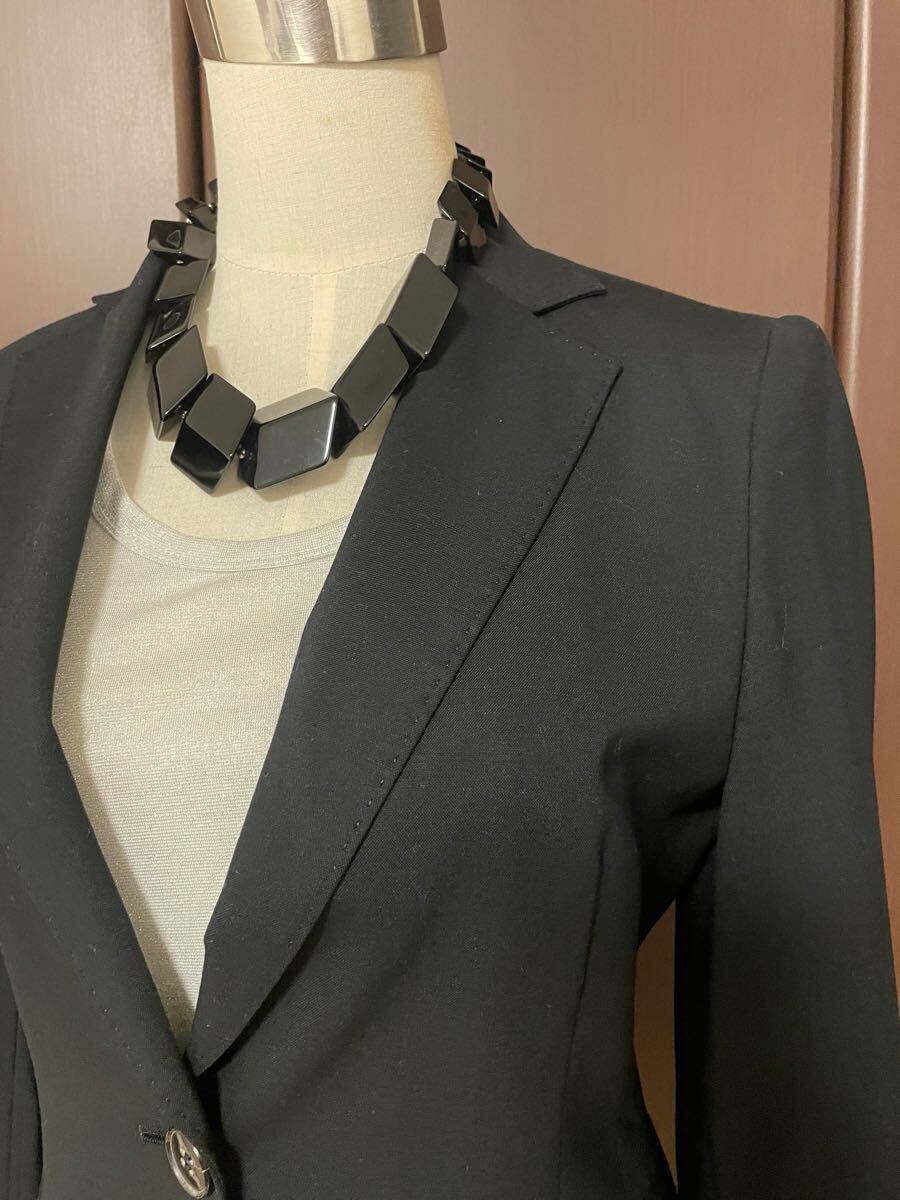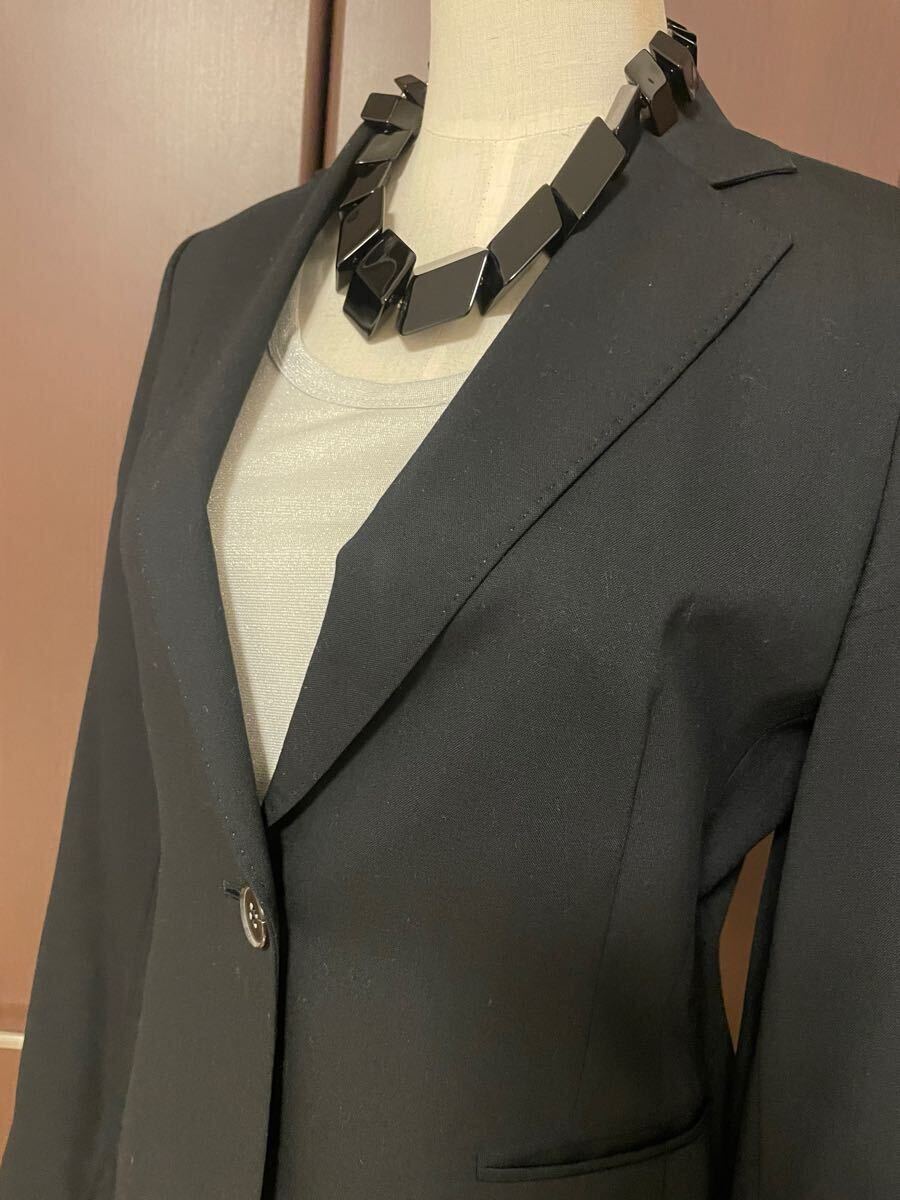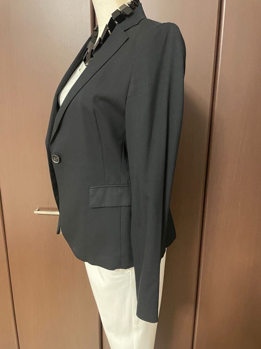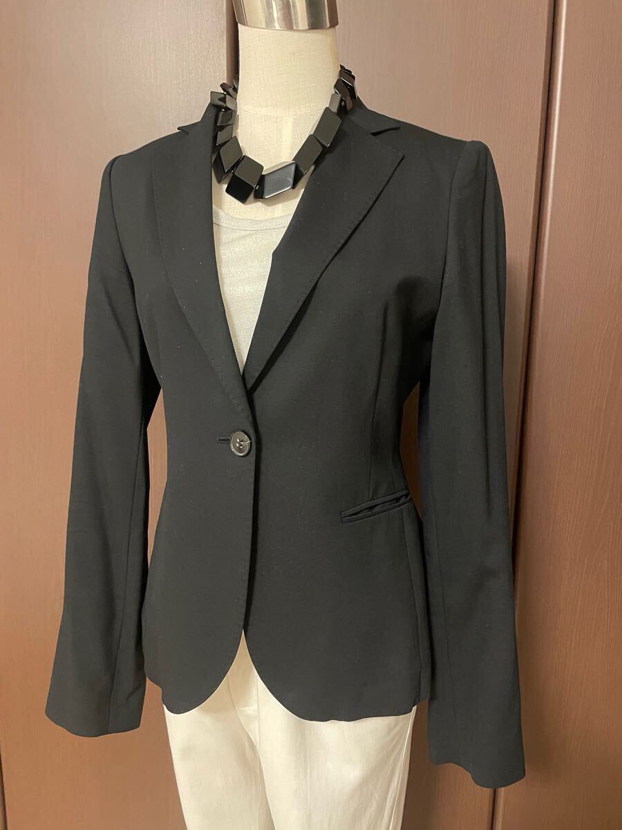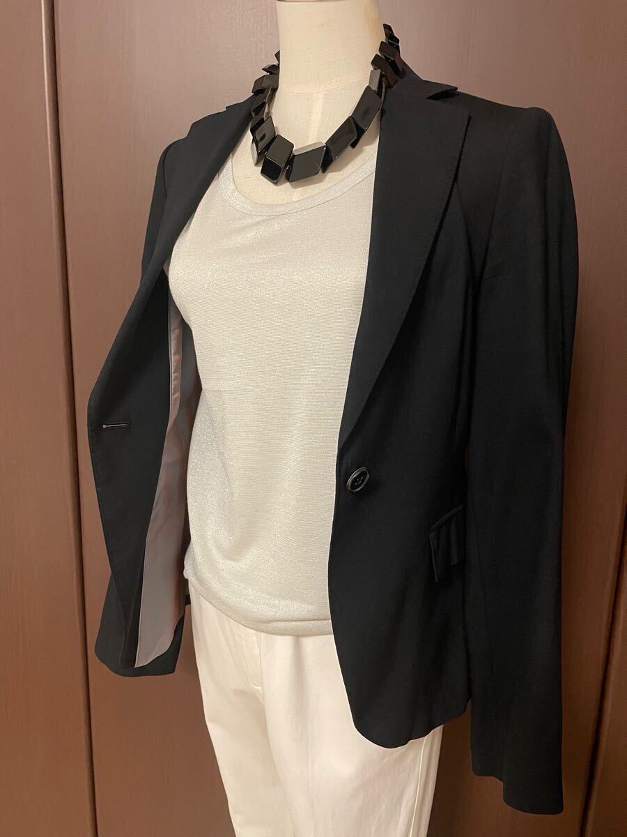 デプレ DES PRES のテーラードジャケットです。黒色。素材は、レーヨン・ウール・ポリウレタン。サイズ2、9号くらい。幅約39㎝、丈約マエ60・ウシロ56㎝。前ボタン1つ。袖ボタン4つ。前側両サイドポケット。後ろベンツ。テカリや擦れ、内側に若干汚れ箇所あり、気になる方はご遠慮ください。商品以外のアクセサリー・インナー・ボトムは含まれません。