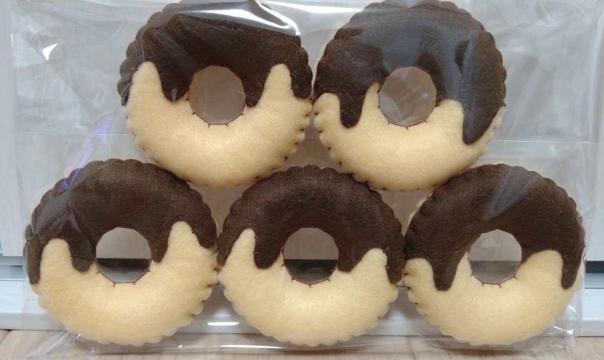 ドーナツ5個♪ 直径約7センチ ハンドメイドの品ですので縫い目等バラつきがありますことをご理解ください。 厚さに制限がありますので、簡易梱包となりますことをご了承ください。
