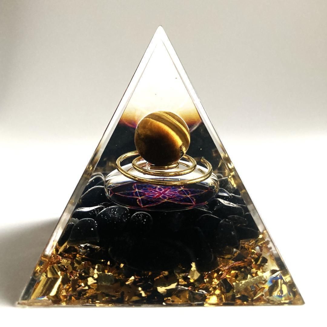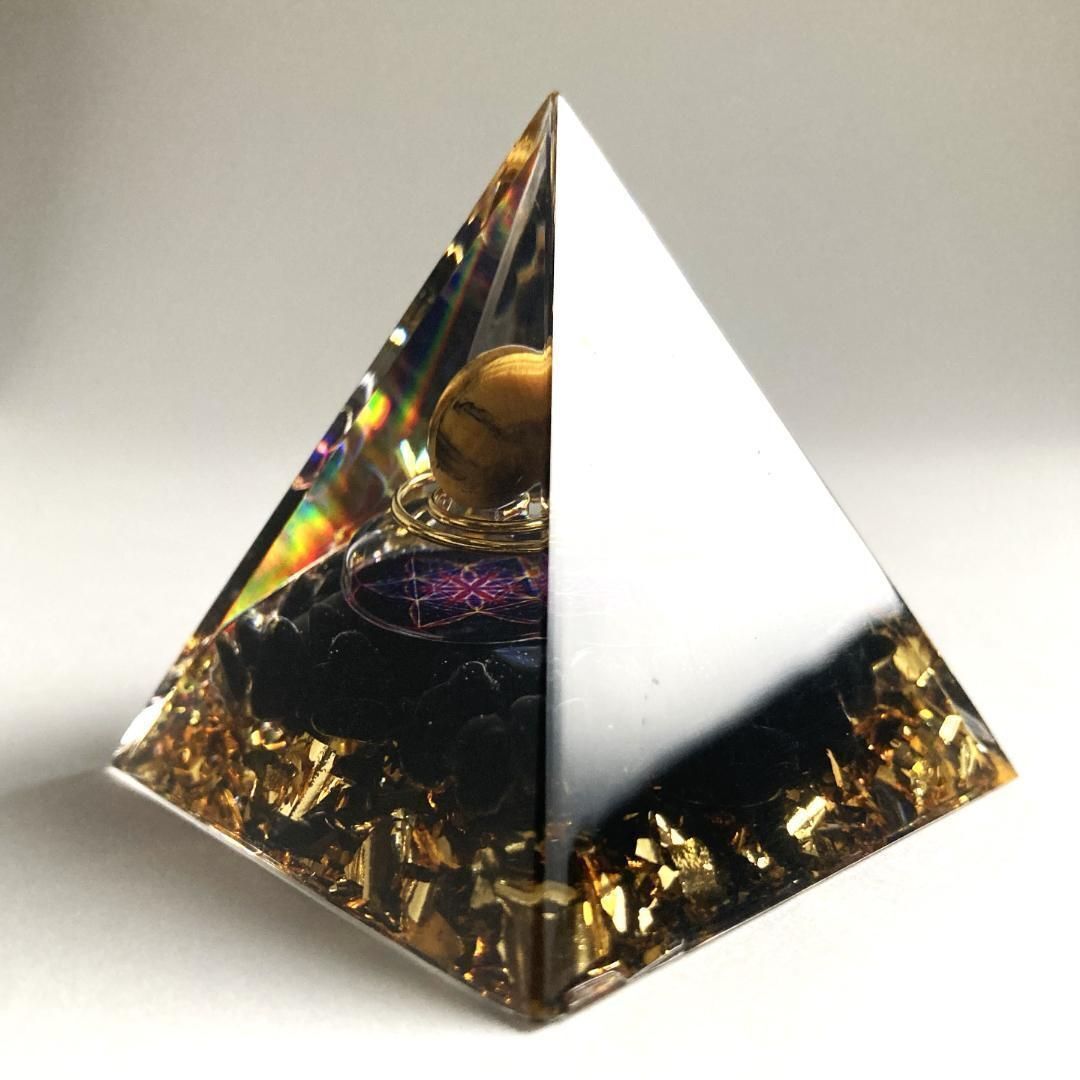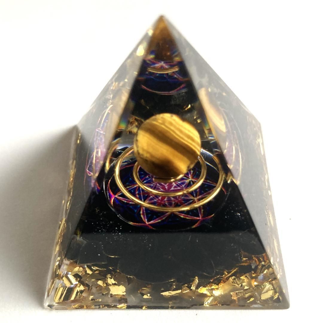 【商品名】G075 オルゴナイト???ピラミッド型 タイガーアイボール オブシディアン???置物 インテリア 浄化