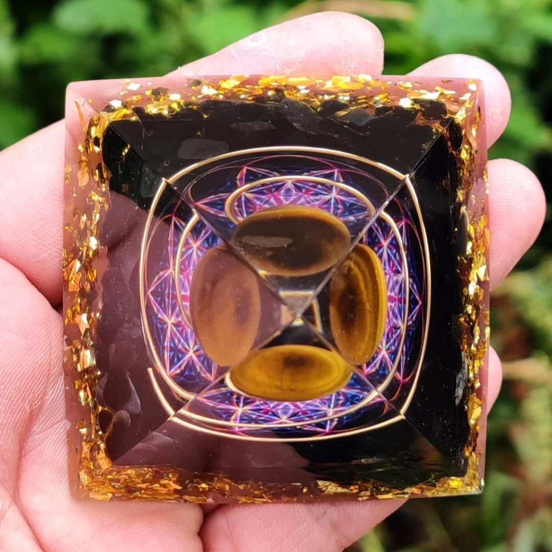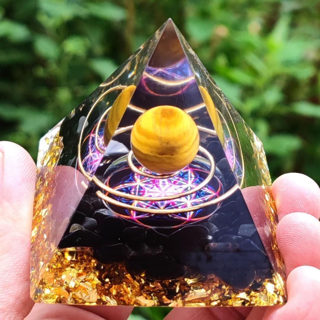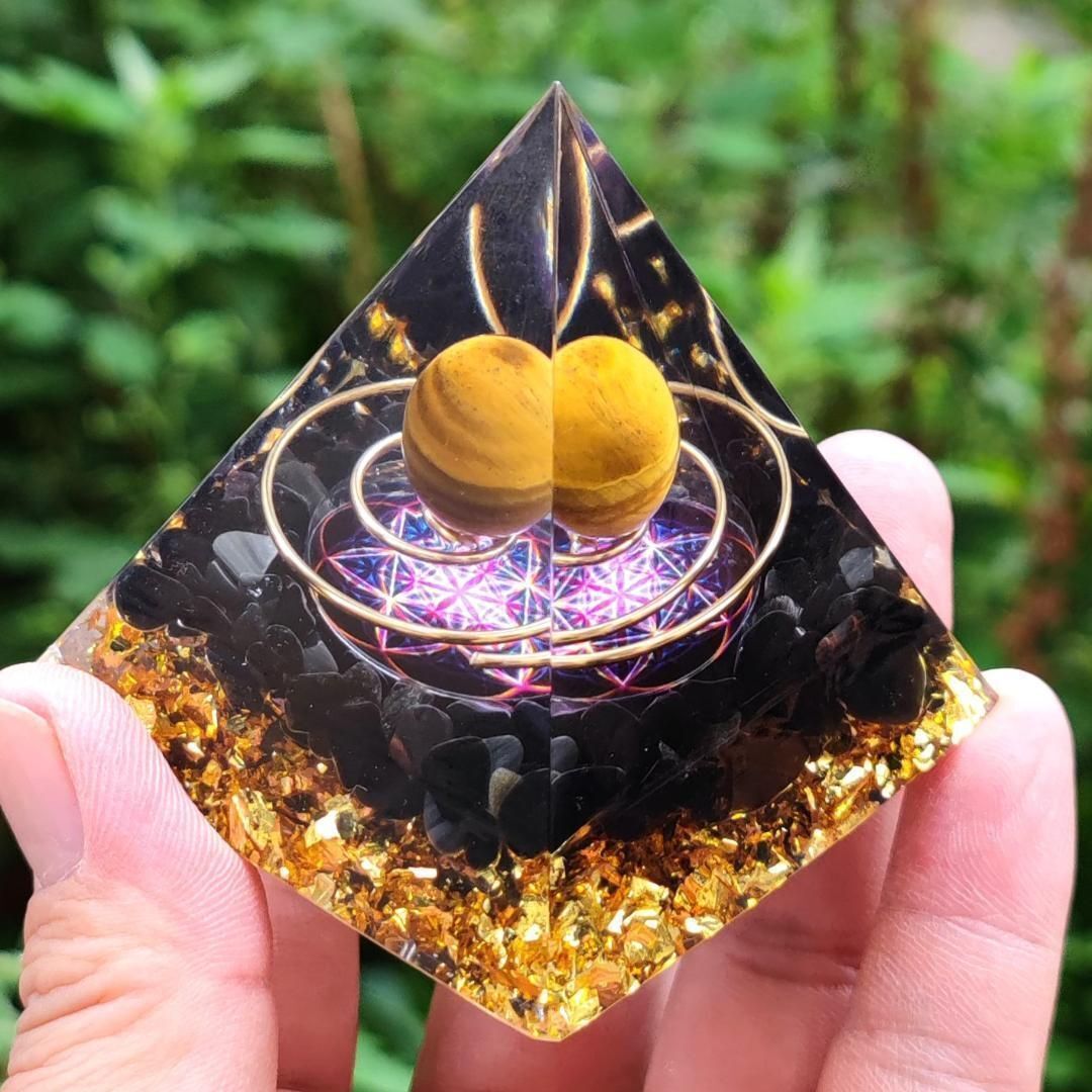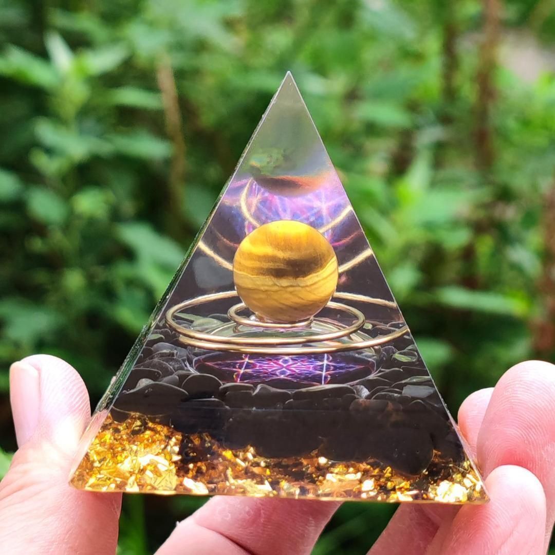 【商品名】G075 オルゴナイト???ピラミッド型 タイガーアイボール オブシディアン???置物 インテリア 浄化