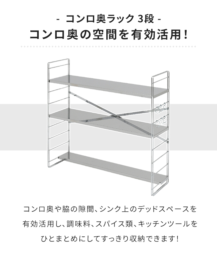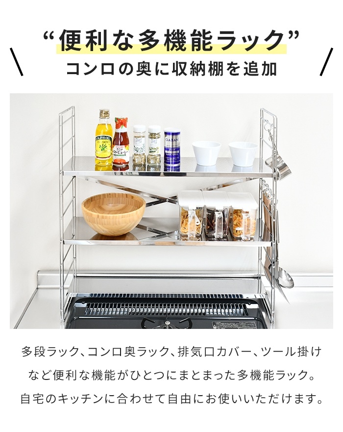コンロ奥ラック ステンレス製 日本製 多機能ラック 調味料ラック 幅65cm 3段 キッチンラック 排気口カバー S字フック付き ステンレス製コンロ奥ラック ステンレスラック 収納ラック オープンラック スリムラック キッチン用品 スパイス収納 コンロ奥 便利 調理器具置き シンプル スタイリッシュ |