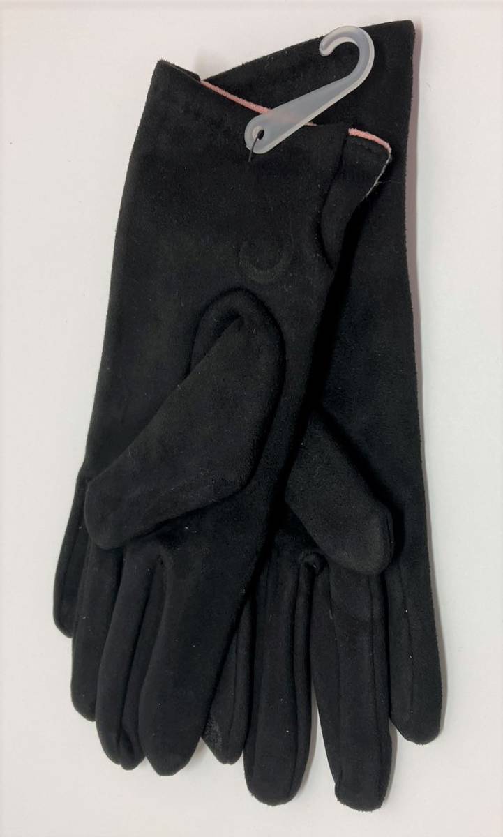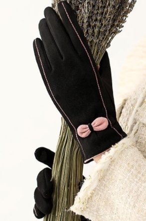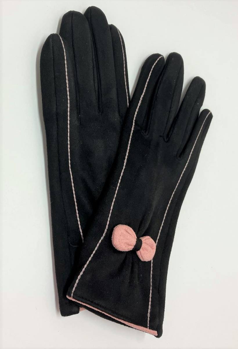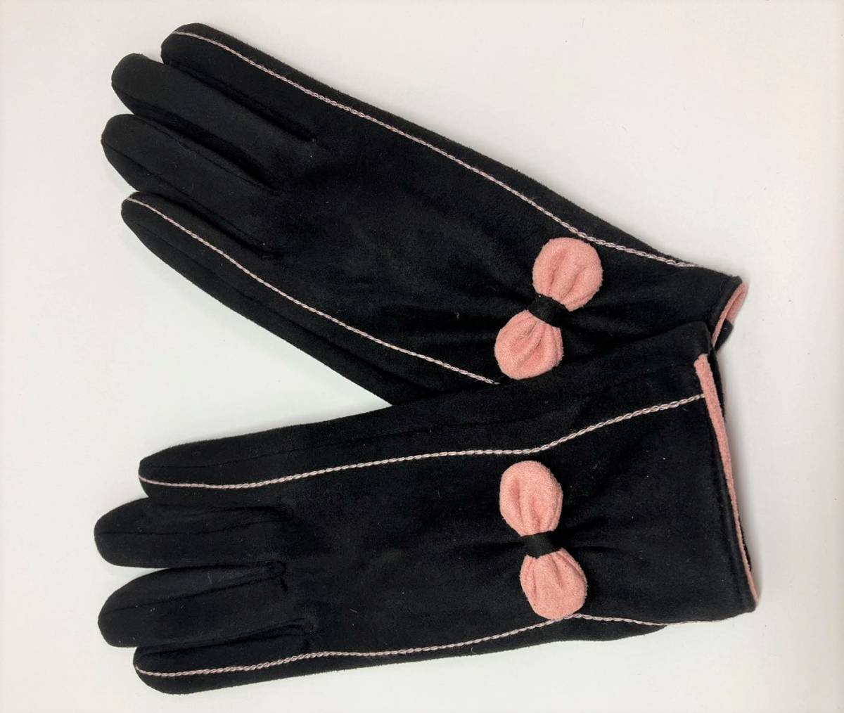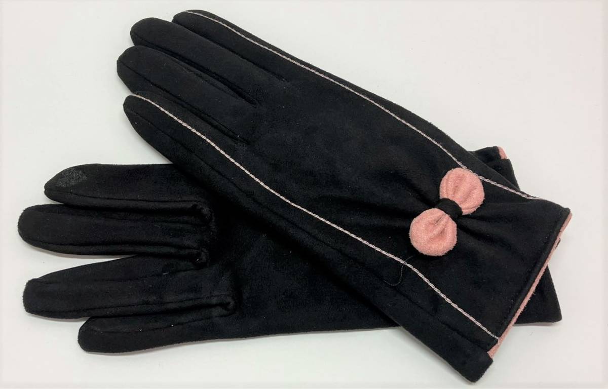 レディース手袋N707 黒 スエード裏起毛 あったか スマホタッチ対応 リボン飾り