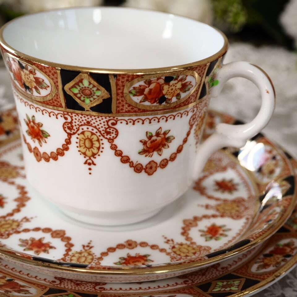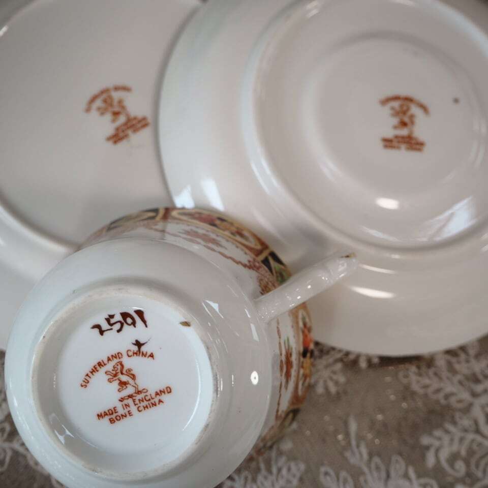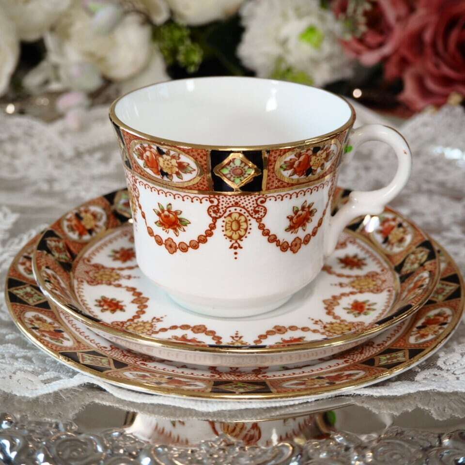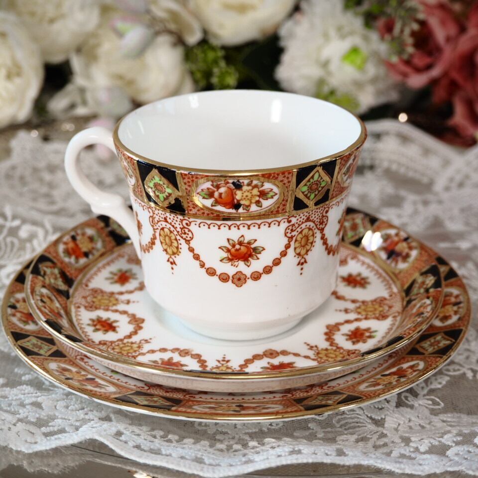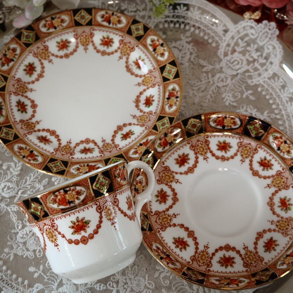 イギリスの老舗陶器メーカー、Sutherlandによる美しいエドワーディアン様式のトリオセット(カップ、ソーサー、プレート)です。