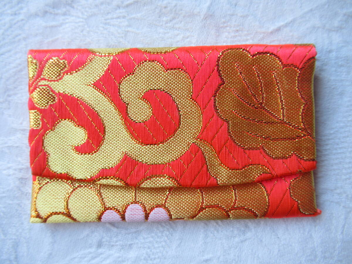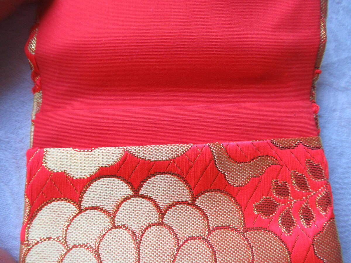 手作り 金襴カードケース名刺入れ保険証入れ (朱赤地に金の線と大輪の菊柄)