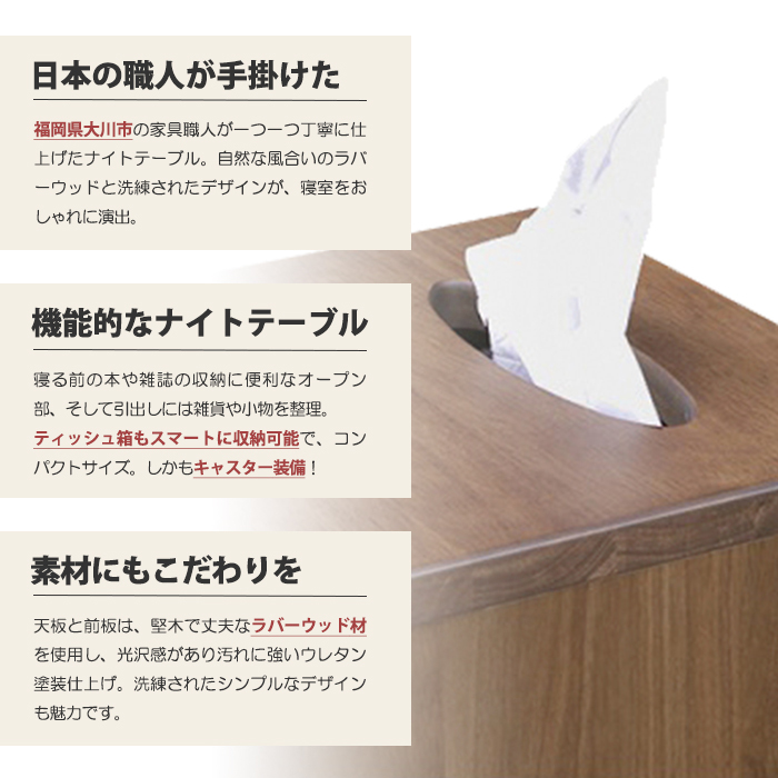 特  徴自然な風合いと機能美が調和する、福岡の職人が手がけたラバーウッドナイトテーブル。