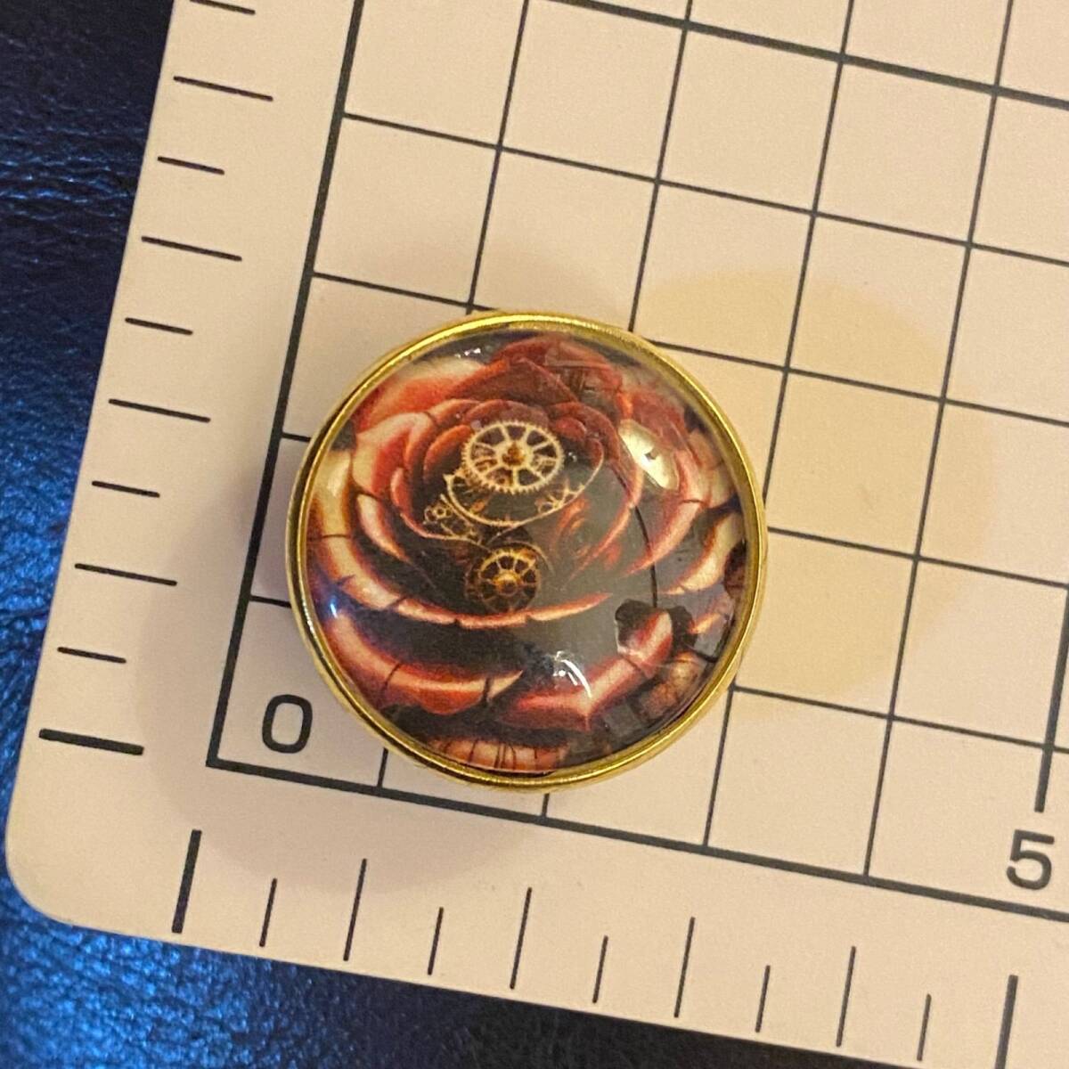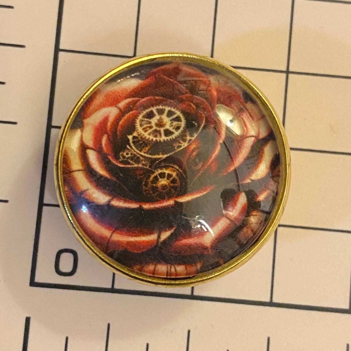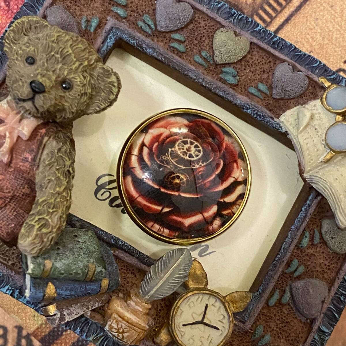 【着物 ハンドメイド ガラス 帯留め|和洋折衷のアクセントに オリジナルデザイン 深紅の薔薇に絡むように組み込まれた歯車が、時の流れを閉じ込めたかのような幻想的なデザイン。 GK-11】