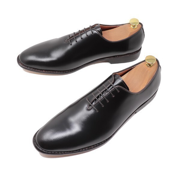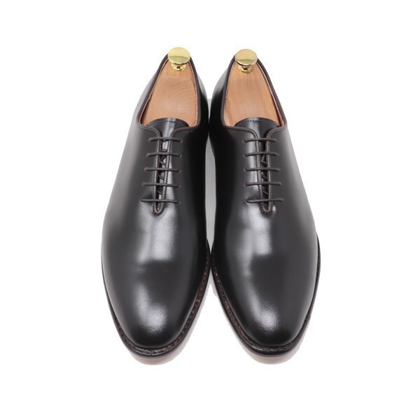 ホールカットシューズとは、通常使用する革より大きな1枚の革でアッパーを包み込むように仕上げ、 縫い合わせが踵部分にしか存在しない大変贅沢なデザインのビジネスシューズです。 質の良い大きな面積の革が必要であり、できるだけシワを出さないよう立体成型するために高度な技術が必要とされます。 このように制作するため手間やコストがかかるためヨーロッパや国内のブランドメーカーなどの高価なものがほとんどであり、 履かれている方も多くはいない大変貴重なデザインで、当店の自信作です。