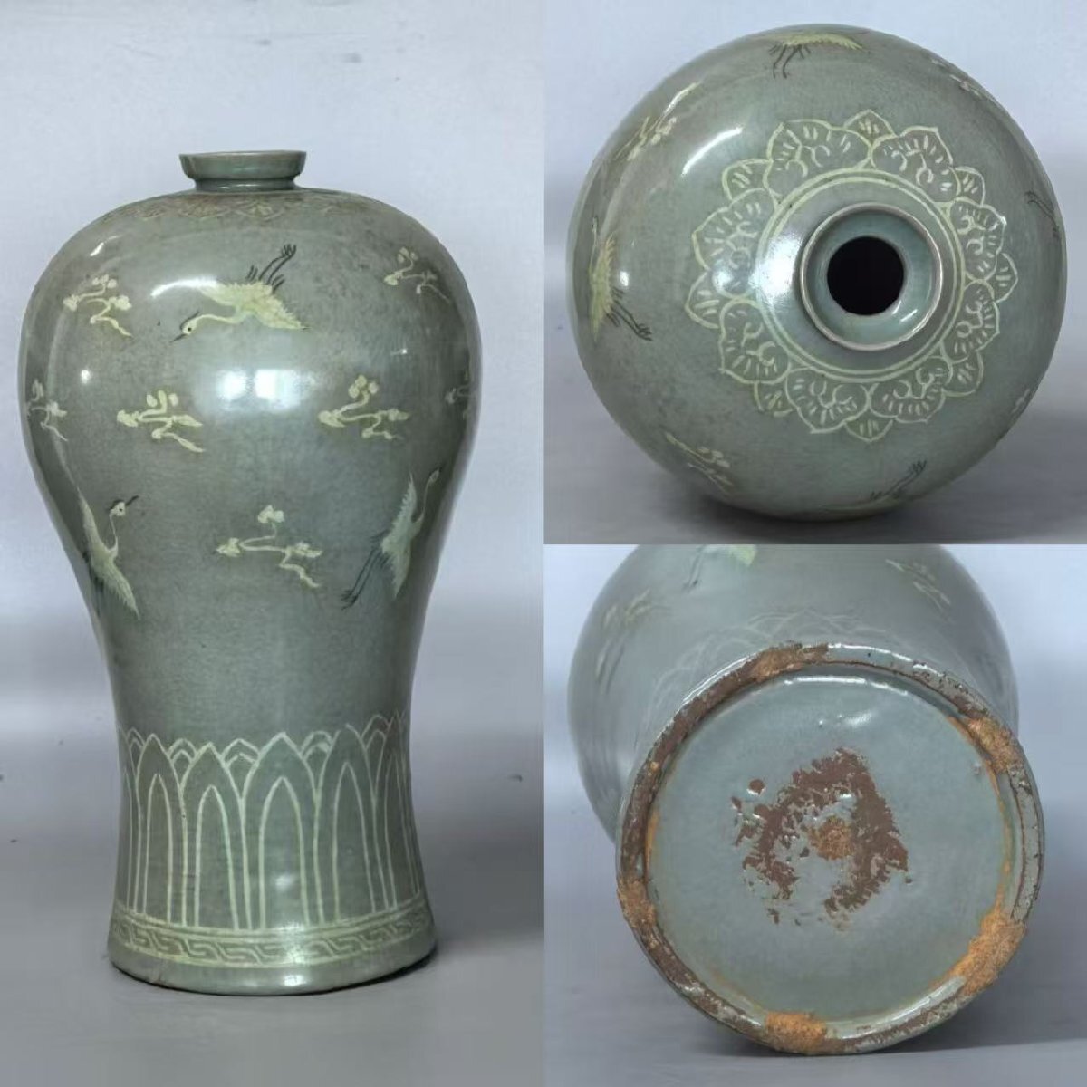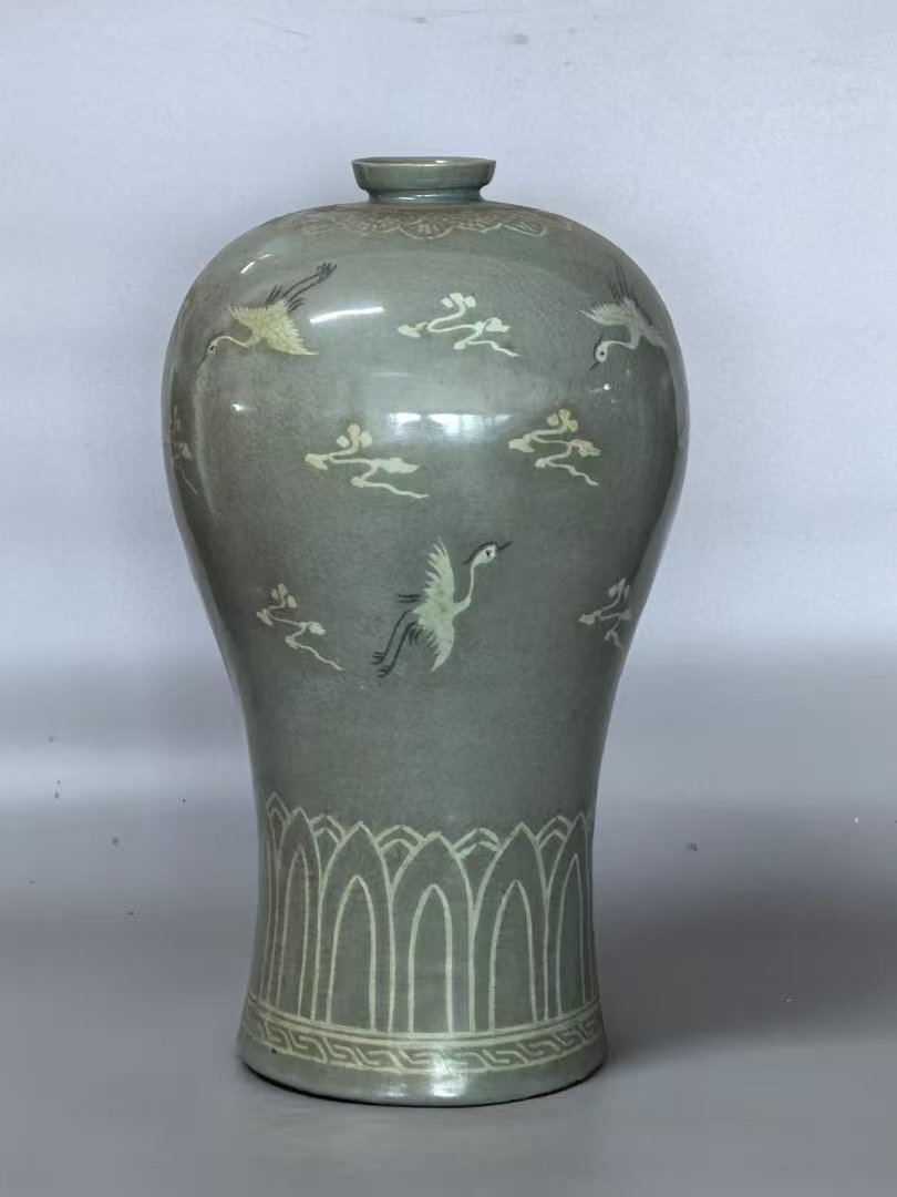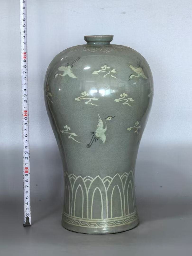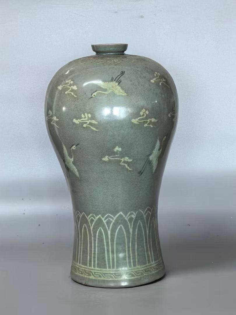 ▼渡鶴羽▼B4533『朝鮮時代旧蔵』朝鮮古陶 朝鮮古美術 高麗磁 古高麗 李朝 高麗青磁雲鶴紋大梅瓶