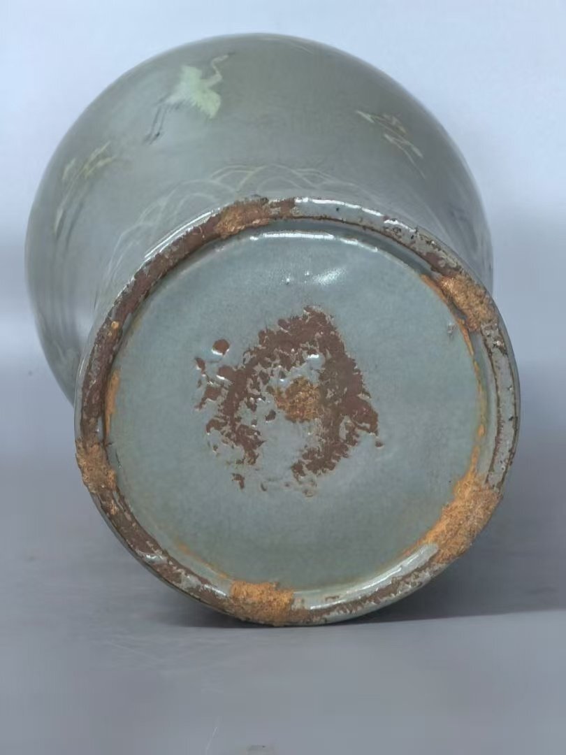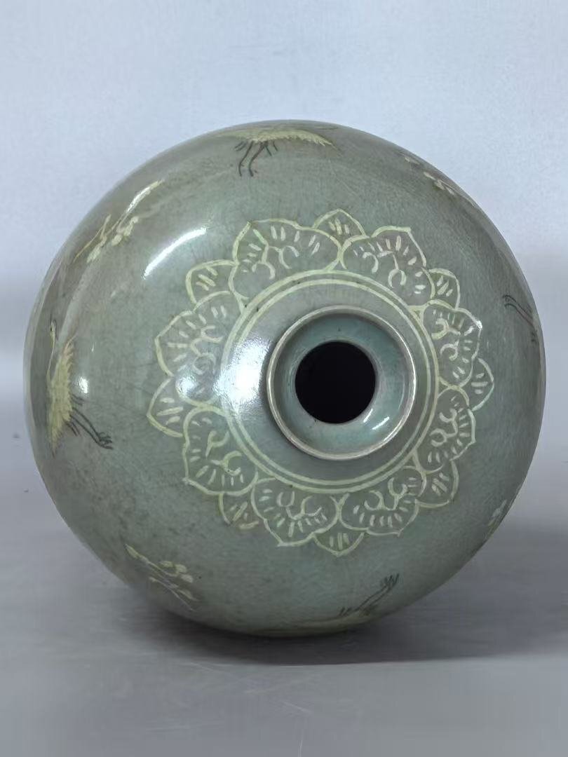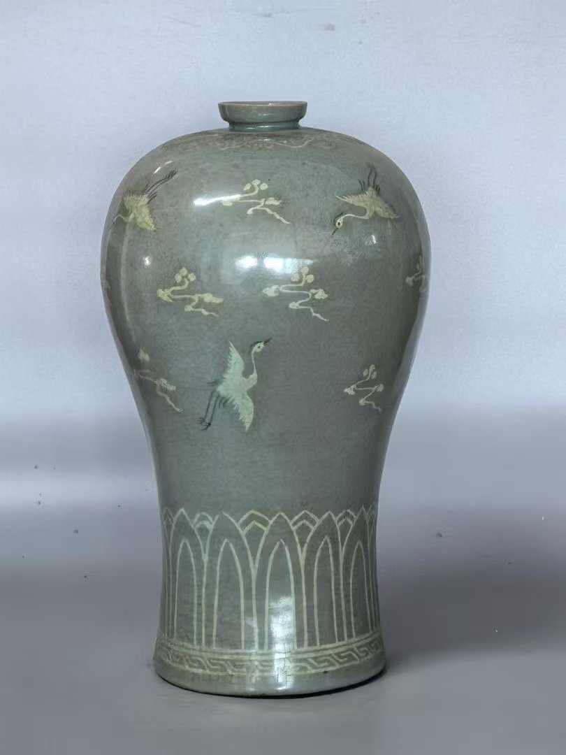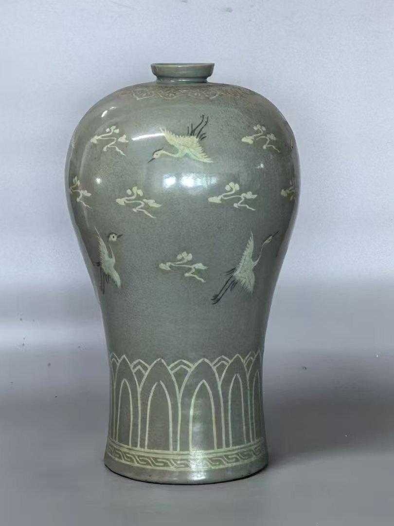 ▼渡鶴羽▼B4533『朝鮮時代旧蔵』朝鮮古陶 朝鮮古美術 高麗磁 古高麗 李朝 高麗青磁雲鶴紋大梅瓶