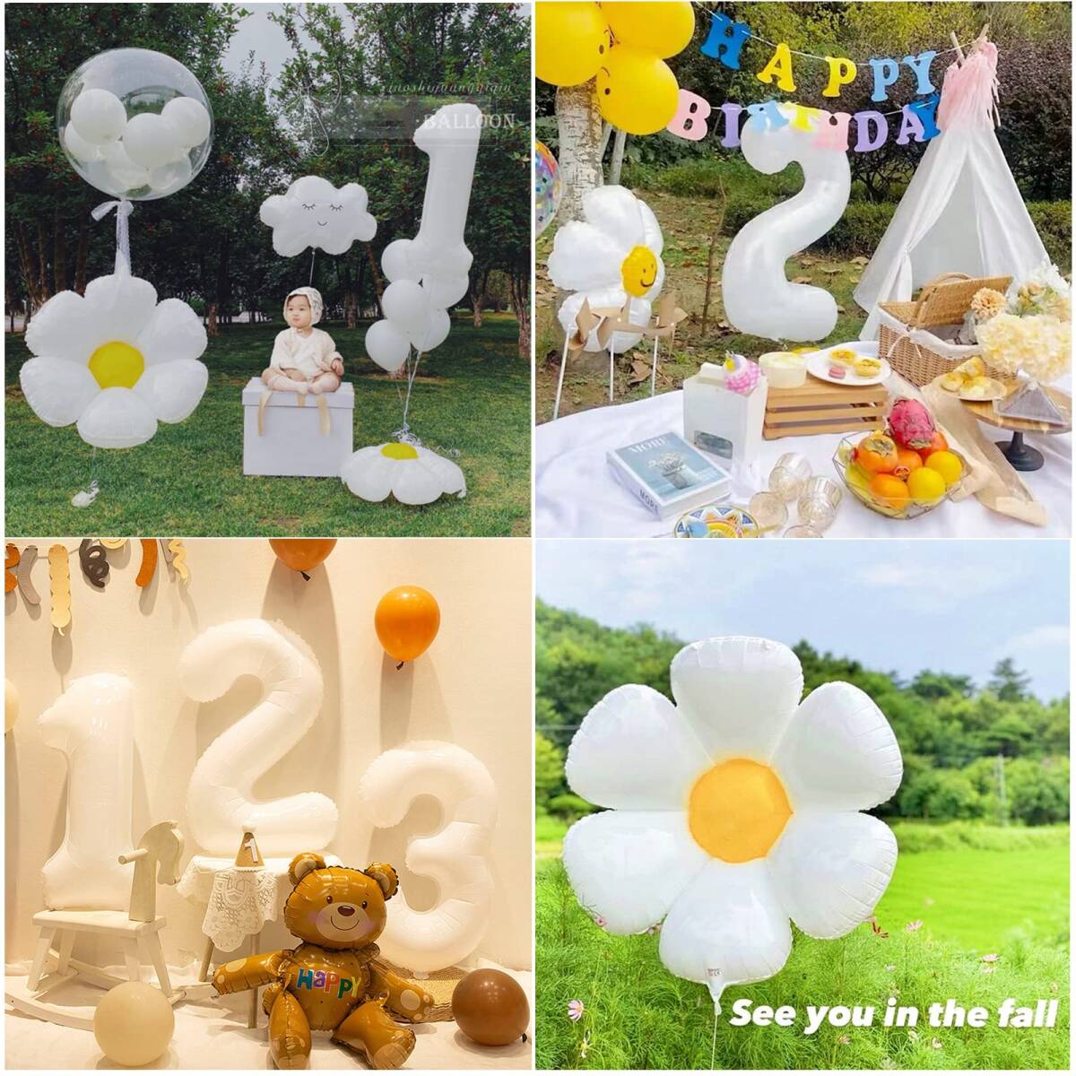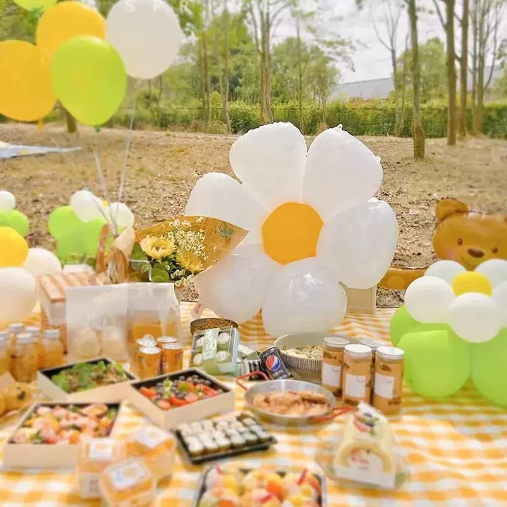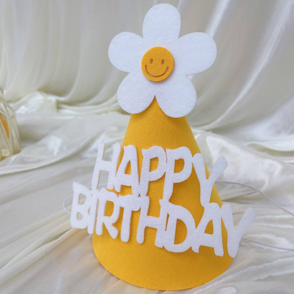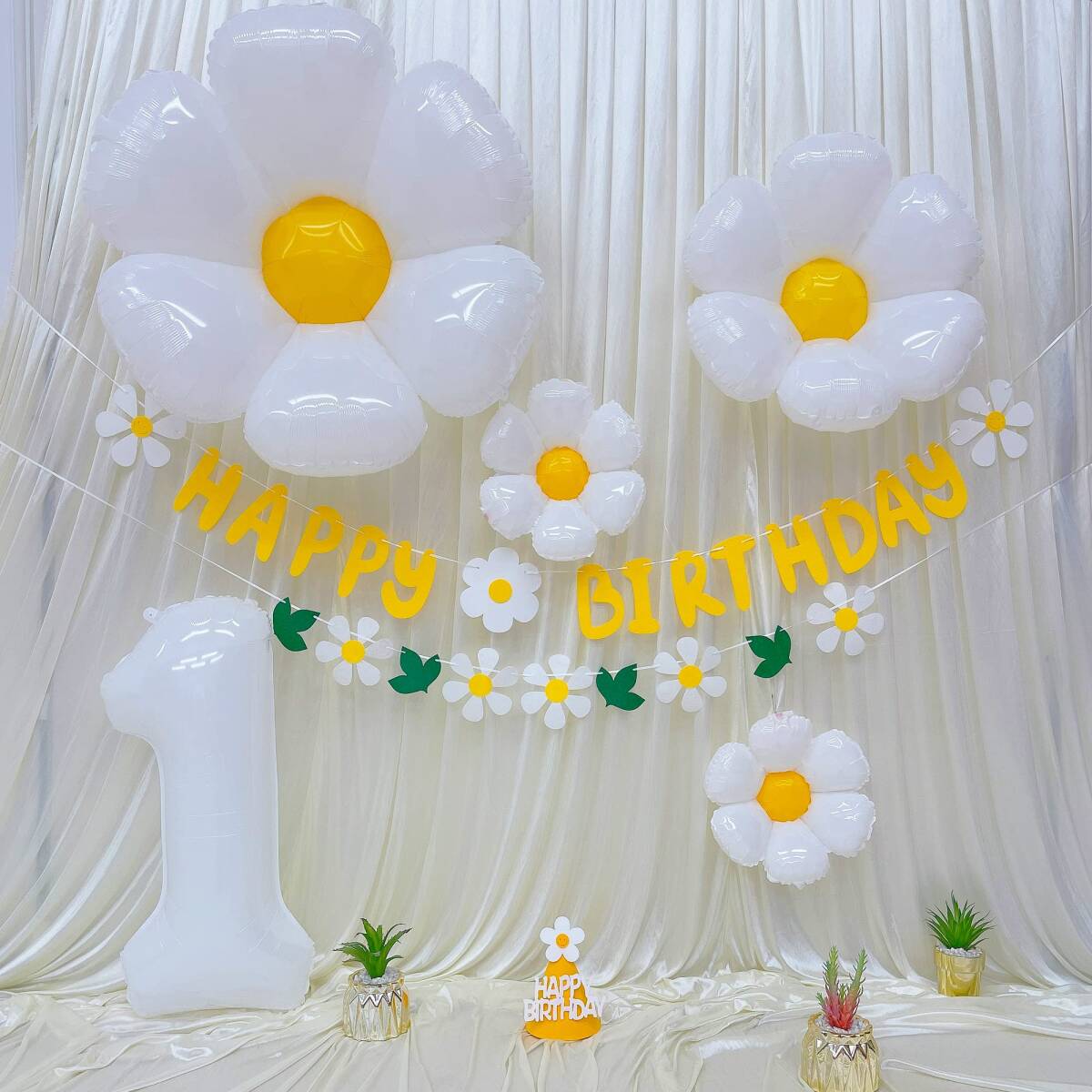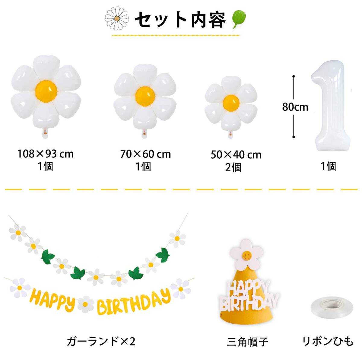 【セット内容】①フェルト布ガーランド×2 ②デイジーバルーン ×4 ③数字バルーン×1 ④三角帽子×1 ⑤リボンひも (10m)