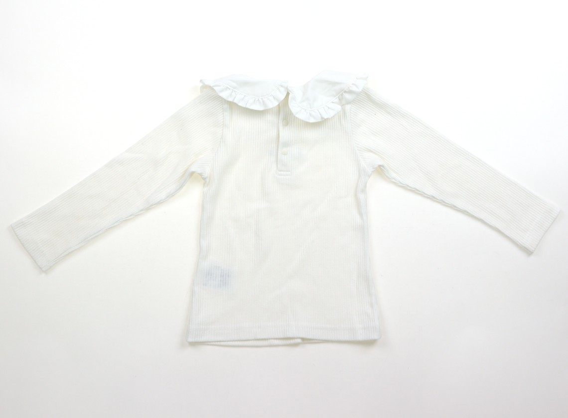 ポリエステル、コットンのリブニット。えりに薄い茶色いシミがあり。袖に黒い毛玉があり。毛羽立ちがありますが、まだまだ普段着として活躍してくれそうです。