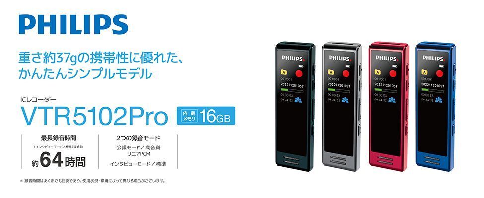 PHILIPS VTR5102PRO-RD レッド ICレコーダー 16GB内蔵 リニアPCM録音対応 手のひらサイズ (YA-VTR-5102PRO-RD) 新品未開封品です。 <主な特長> ・用途で使い分ける2つの録音モード: 1) 会議モード(リニアPCM録音)/高音質:〔サンプリング周波数:48kHz、ビットレート:1,536kbps〕 アナログ音声をデジタルの信号に置き換えて保存します。一般のICレコーダーで使われている圧縮された音声データとは異なり、元の音源を圧縮加工しないリニアPCM録音では、本来の音とも言える「原音」を残すことができ、CD以上の高音質での録音が可能。(データの容量は大きくなります。) 2) インタビューモード/標準:〔サンプリング周波数:16kHz、ビットレート:512kbps〕 近距離での録音に最適。録音されたデータのファイルサイズも会議モードに比べて小さめです。 ・予約録音と録音のタイマー機能: 1) 予約録音機能:希望の日時を設定し、録音の予約が可能です。 2) 録音時間の設定(オフタイマー):予約録音の録音時間を30分/60分/120分から指定できます。 (設定しない場合、継続録音となります。) 内蔵メモリー容量:16GB 最大録音時間:64時間 ★商品の仕様等に関しては、商品名に基づきご自身でご確認のうえご入札をお願いいたします。 詳しくはこちらをご覧ください。 初期不良や不具合はご自身でメーカーへ対応して下さい。 いかなる場合も返品には承れません。 | |