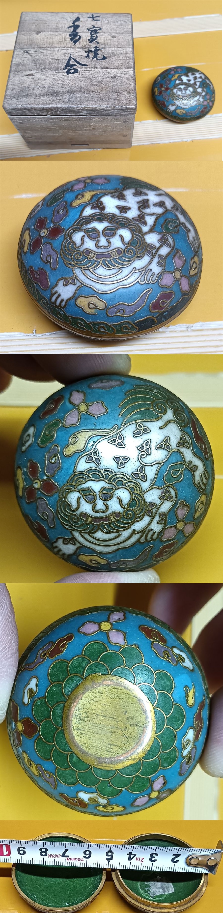 中国美術 古金銅 香合 煎茶道具 無銘 七宝焼 骨董 古美術 金彩 獅子模様 唐物 古玩 時代物 希少 総柄 青銅 獣 飾物 動物