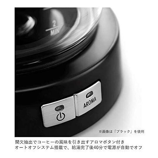 1.コーヒーの風味を引き出すアロマボタンアロマボタンを押せば、蒸らしながらじっくり淹れる、本格的なハンドドリップの手法に近い間欠抽出で、コーヒーの風味を最大限に引き出します。