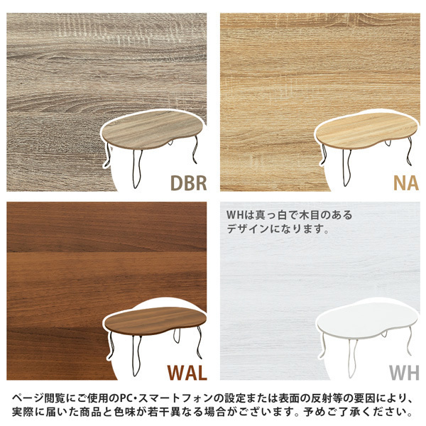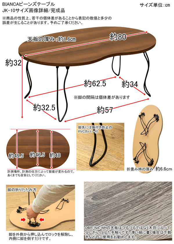 商品説明 | BIANCA ビーンズテーブル ホワイト(WH) 落札後、最初の連絡で配達伝票に記載する電話番号をお尋ねします BIANCA ビーンズテーブルです 可愛い豆型天板のテーブルです 表面全体に擦れたような模様がありますが仕様になります サイズ・容量 幅800×奥行495×高さ320mm(梱包サイズ:幅855×奥行530×高さ95mm) 天板厚:約16mm 折りたたみ時厚み:約66mm 完成品(1個口) 規格 天板:天然木化粧繊維板(PVC貼り) 脚:スチール(エポキシ粉体塗装) 原産国:台湾 ホワイト(WH)専用ページです、ナチュラル(NA)、ウォールナット(WAL)、ダークブラウン(DBR)も有りますが別ベージとなってます。 (1枚目の写真は取扱いカラー全色を載せていますが、専用ページカラー以外の画像は参考として下さい) カタログ価格15800円 |