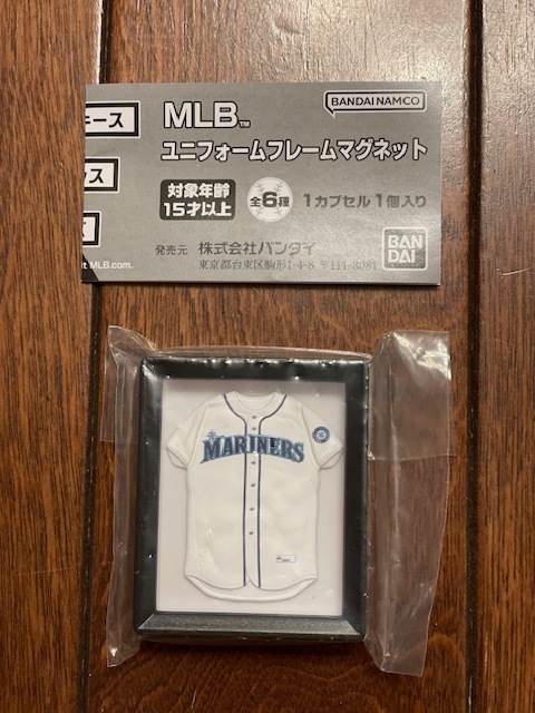 バンダイから発売の500円ガチャ「MLB ユニフォームフレームマグネット」全6種のうち「マリナーズ」です。500円ガチャだけあって、ユニフォームの膨らみや肩部分のチームロゴ(ヤンキースを除く)等、細部まで大変精巧に作られており、MLBファンには垂涎もののミニフィギュア間違いなしです。フレーム入りで、裏面はマグネットが付いています。縦約5.0センチ、横約4.2センチ、厚さ約1.2センチです。内袋未開封(密封式ではなくテープで貼付け)、リスト付きです。