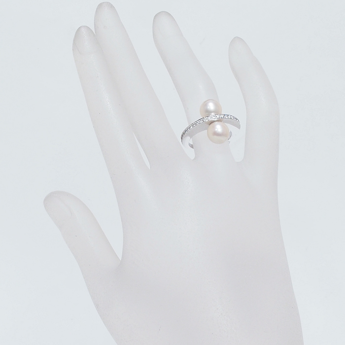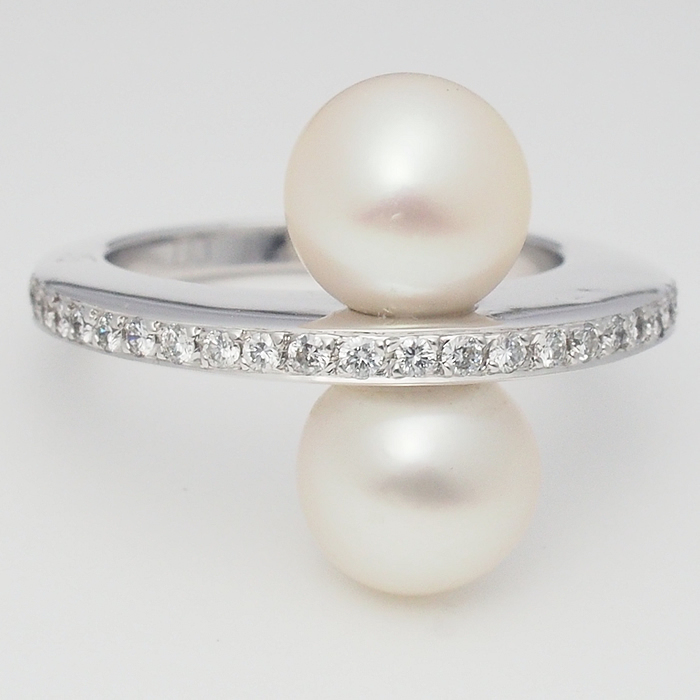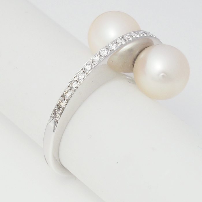 2つのアコヤパールと煌めくダイヤモンドで仕立てたホワイトゴールド製のリングです。