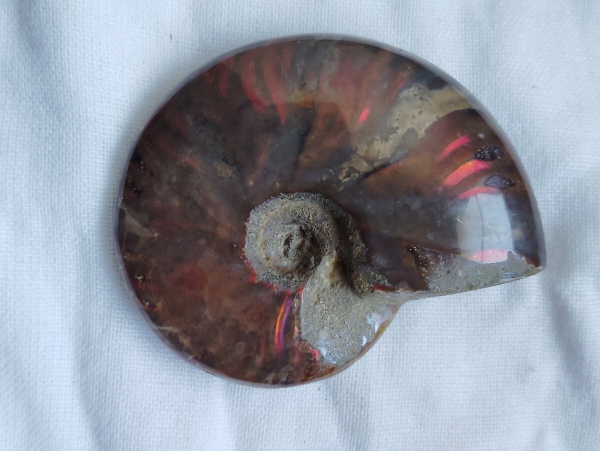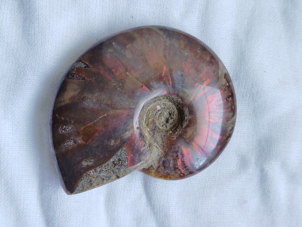 台をのぞいて80×65×14mm、137gの虹色に輝くアンモナイト化石です。