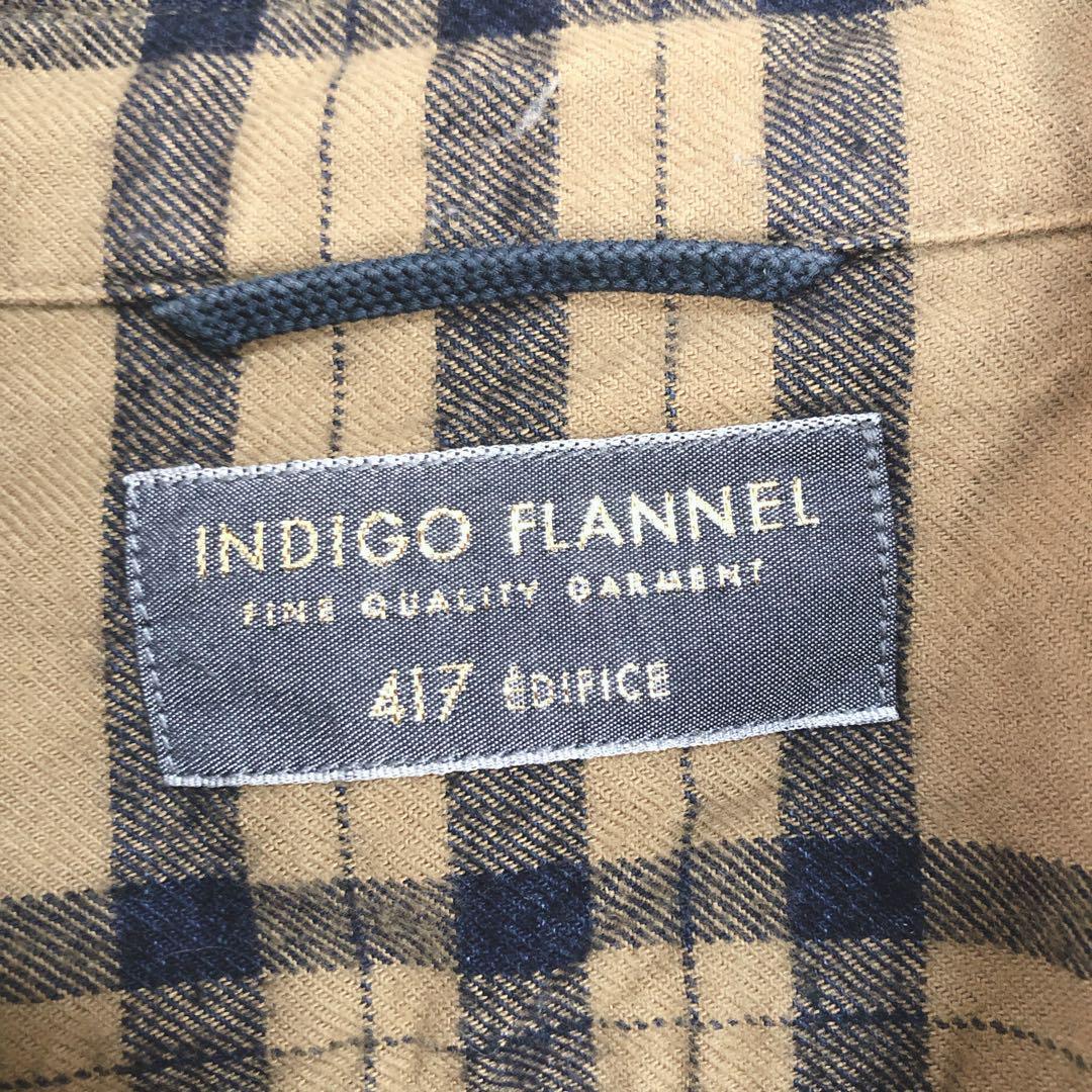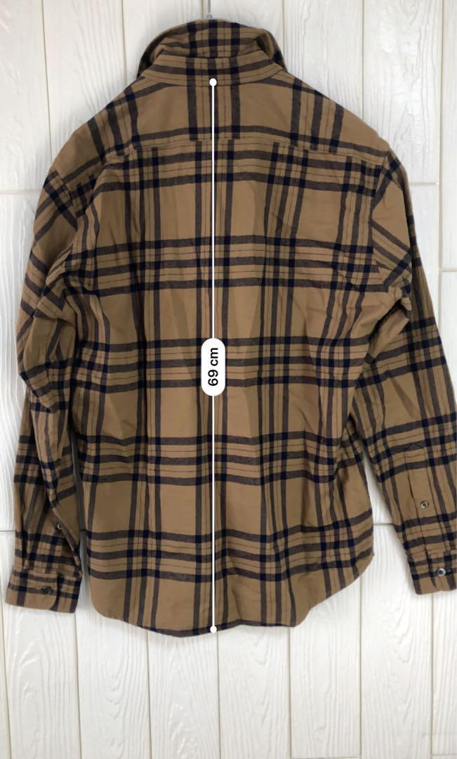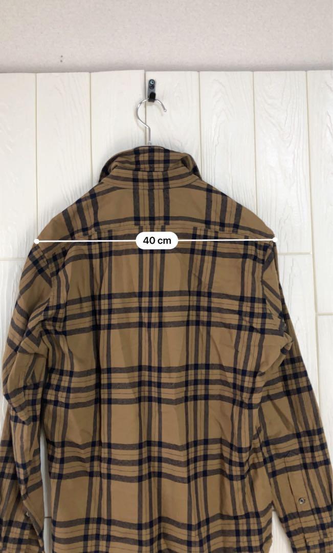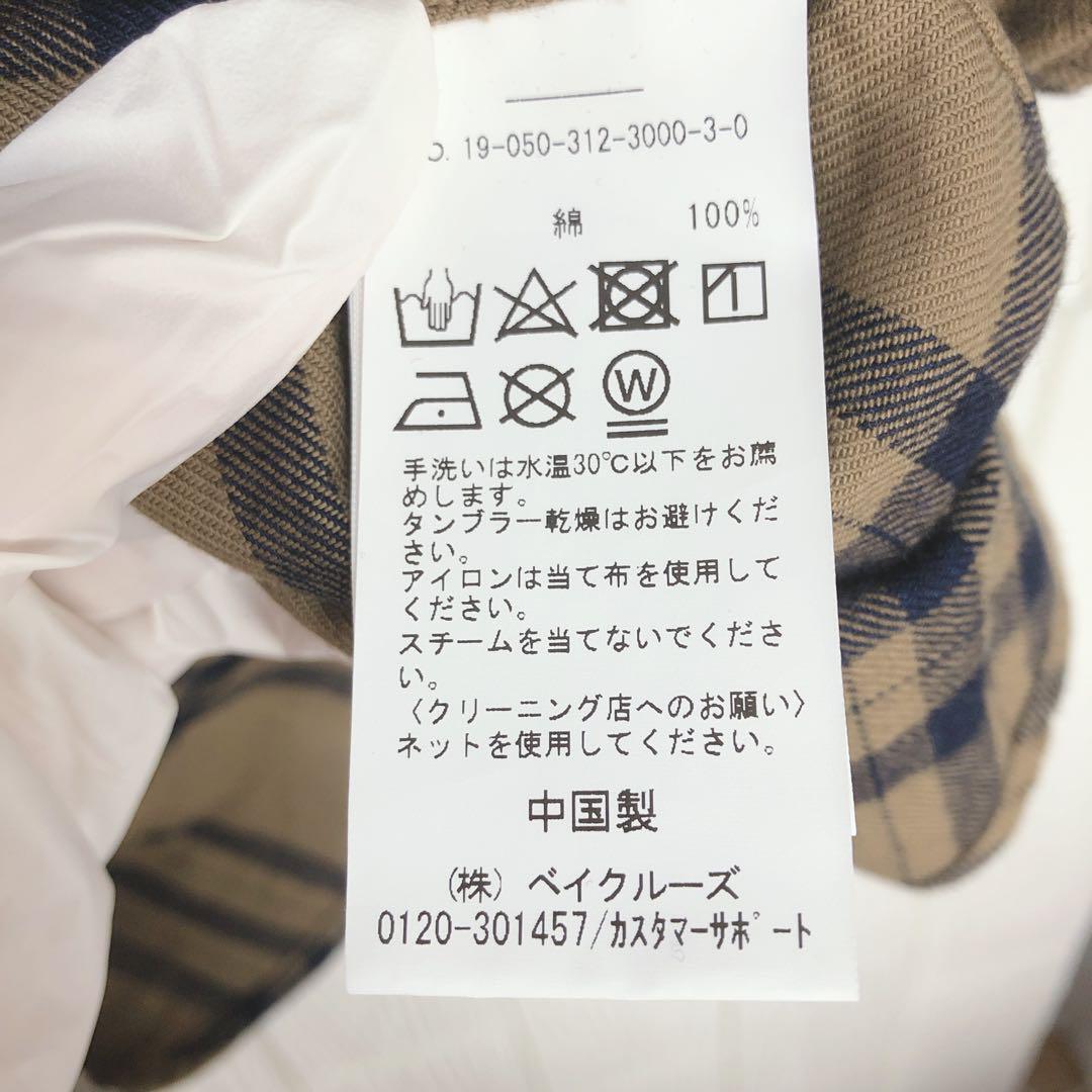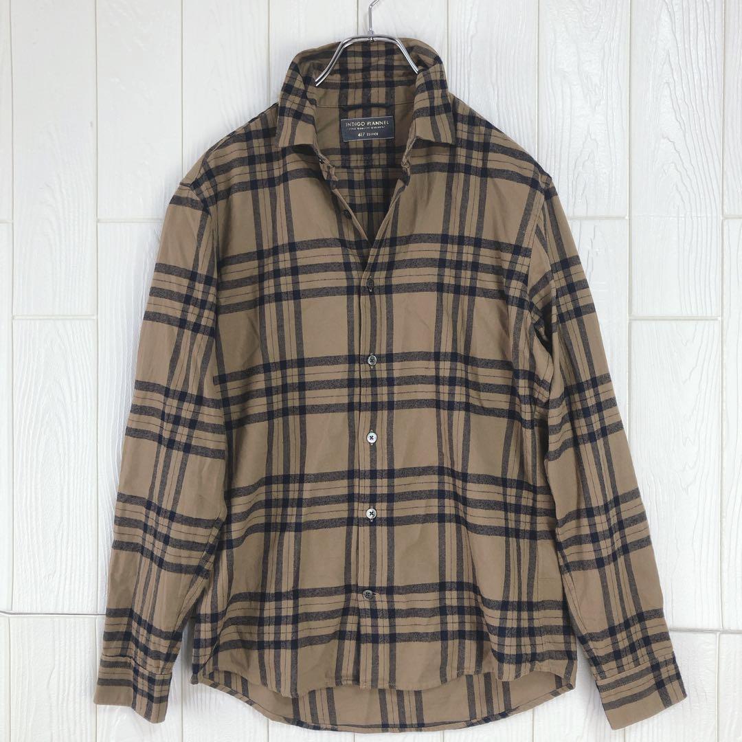 ベージュとネイビーのチェック柄の長袖ネルシャツ、肩幅40cm、着丈69cmで快適な着心地。
