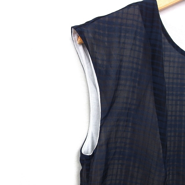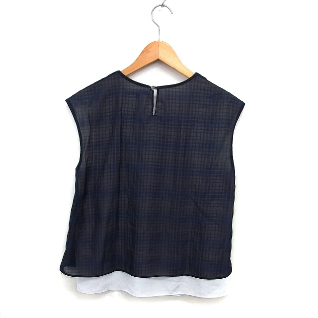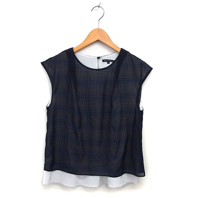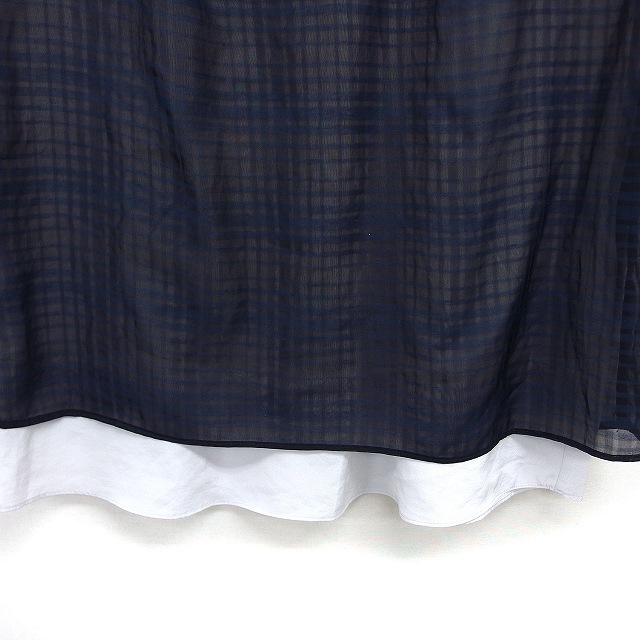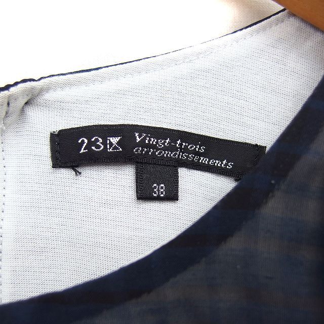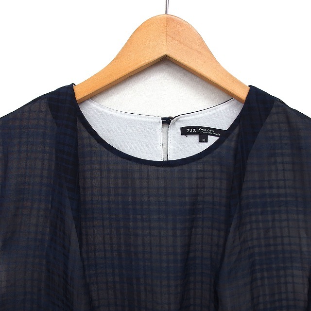23区 オンワード樫山 フレンチスリーブ ブラウス カットソー シフォン チェック 透け感 切替 半袖 38 紺 ネイビー /NT3 レディース