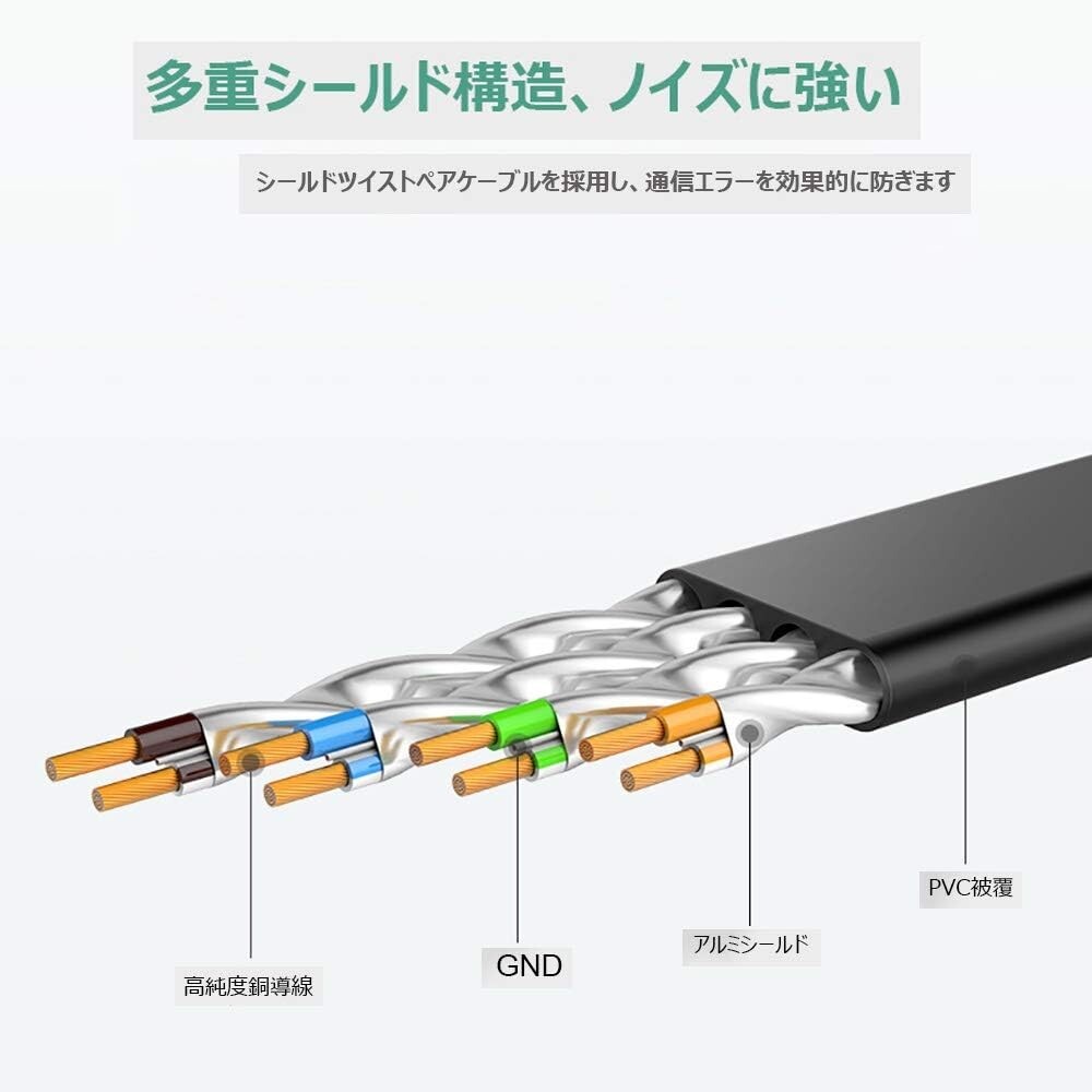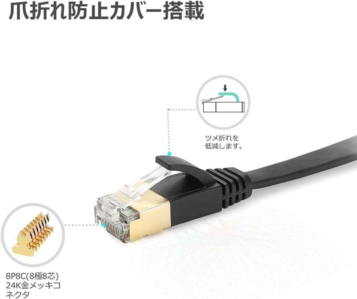 • 特徴:両端コネクタ付(8芯 鍍金RJ45 スリムコネクタ採用)。内蔵100%裸銅線(シールドケーブル)、最小ノイズと混信を保証します。。ツメ折れ防止カバー、曲げても折れない。ノイズ干渉も強い、高速で安定した。