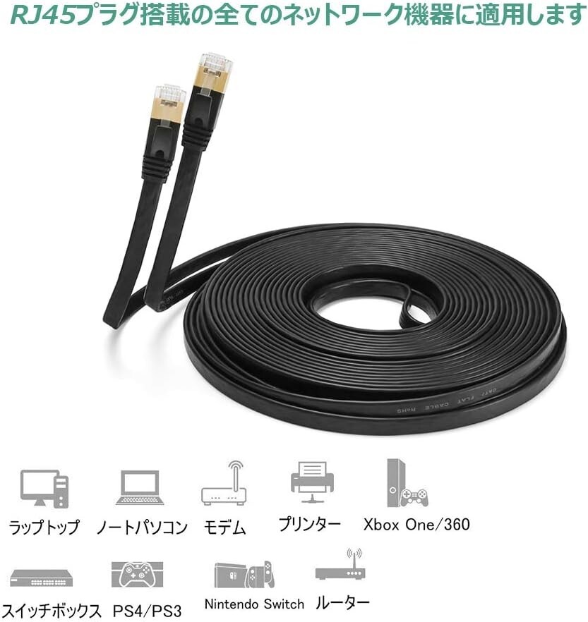 • 互換性:既存のCAT5、CAT5E、CAT6、Cat6a LANケーブルなどと互換性があります。両端はRJ45コネクタで特に設定なし、ルータ、スイッチ、ハブ、ネットワークプリンタ、PS2、PS3、PS4、RJ45プラグを搭載したゲームボックス等に適用します。