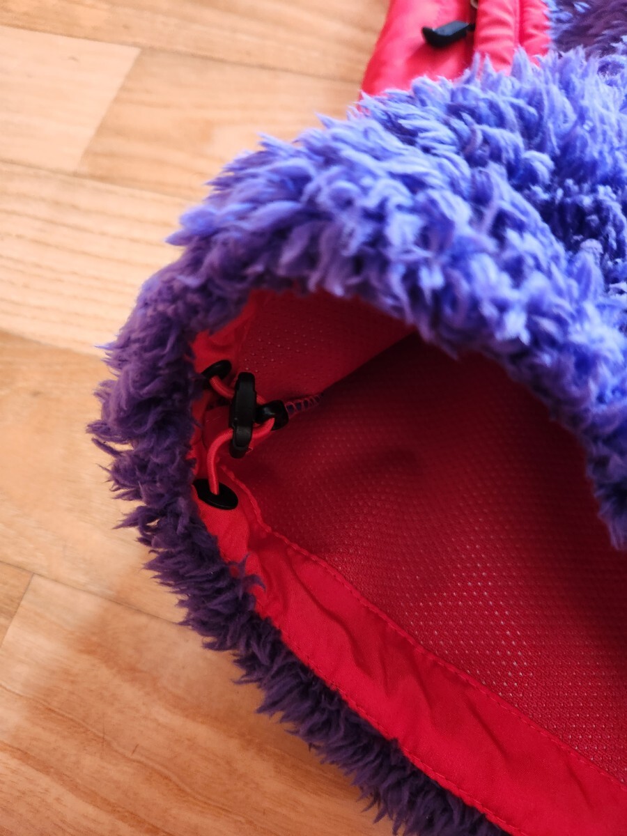 表地は毛足の長いボア、内側は蒸れ防止のメッシュ生地が付きます。裾の所にドローコードが付きます。