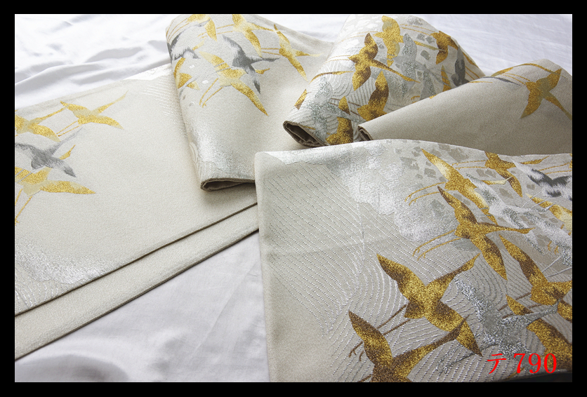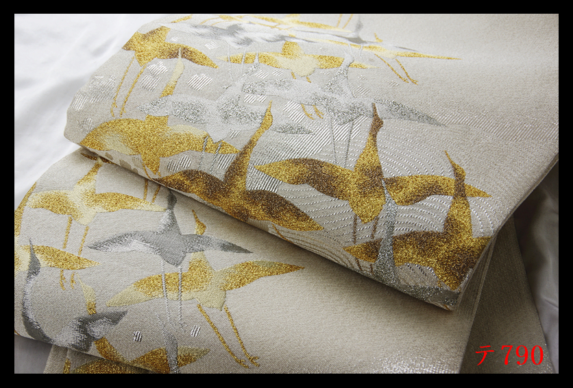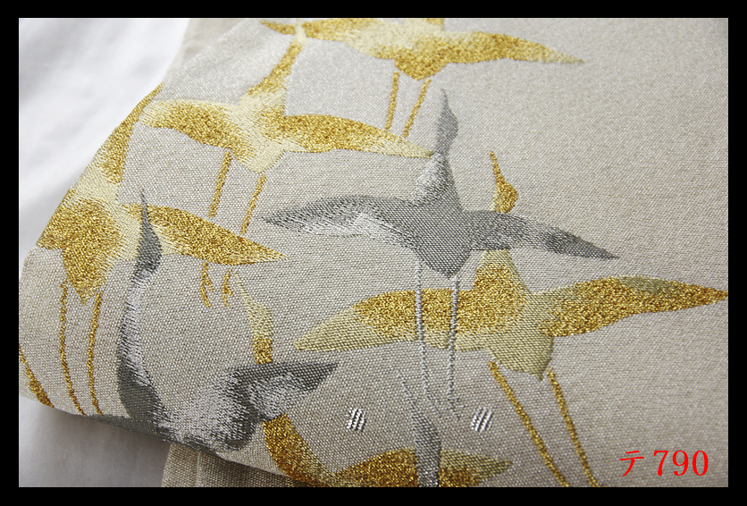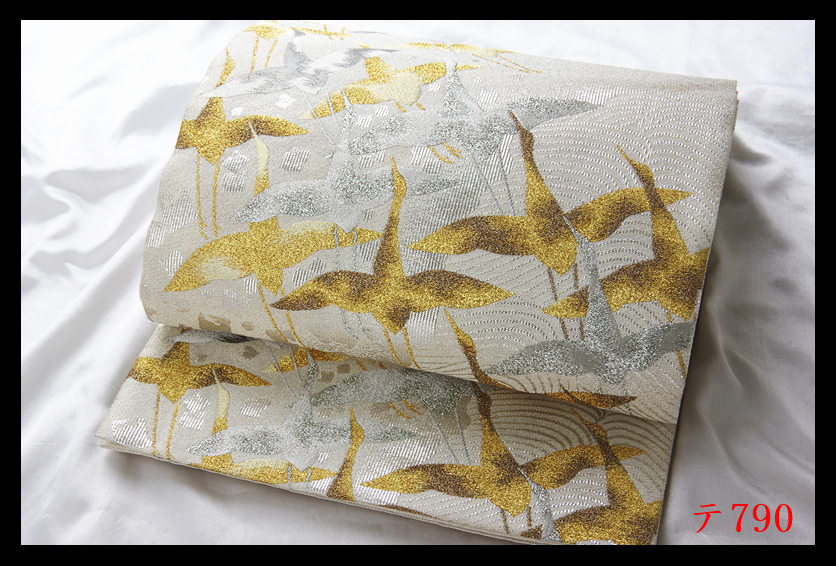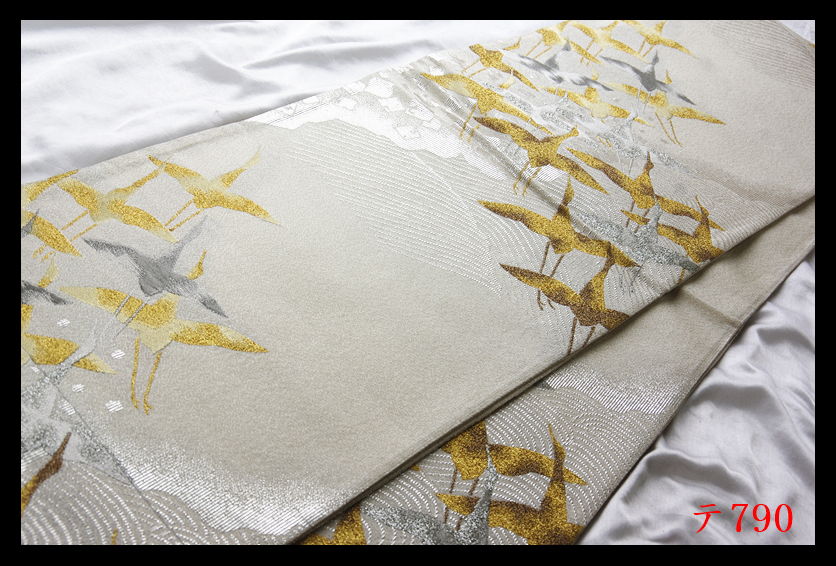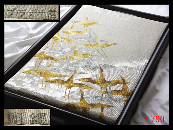 蔵【テ790】西陣逸品 プラチナ箔 明綴 波頭飛鶴紋 シルバー色地 正絹純金糸六通高級美術袋帯 ◇検◇簪着物名古屋帯和装小物帯締め