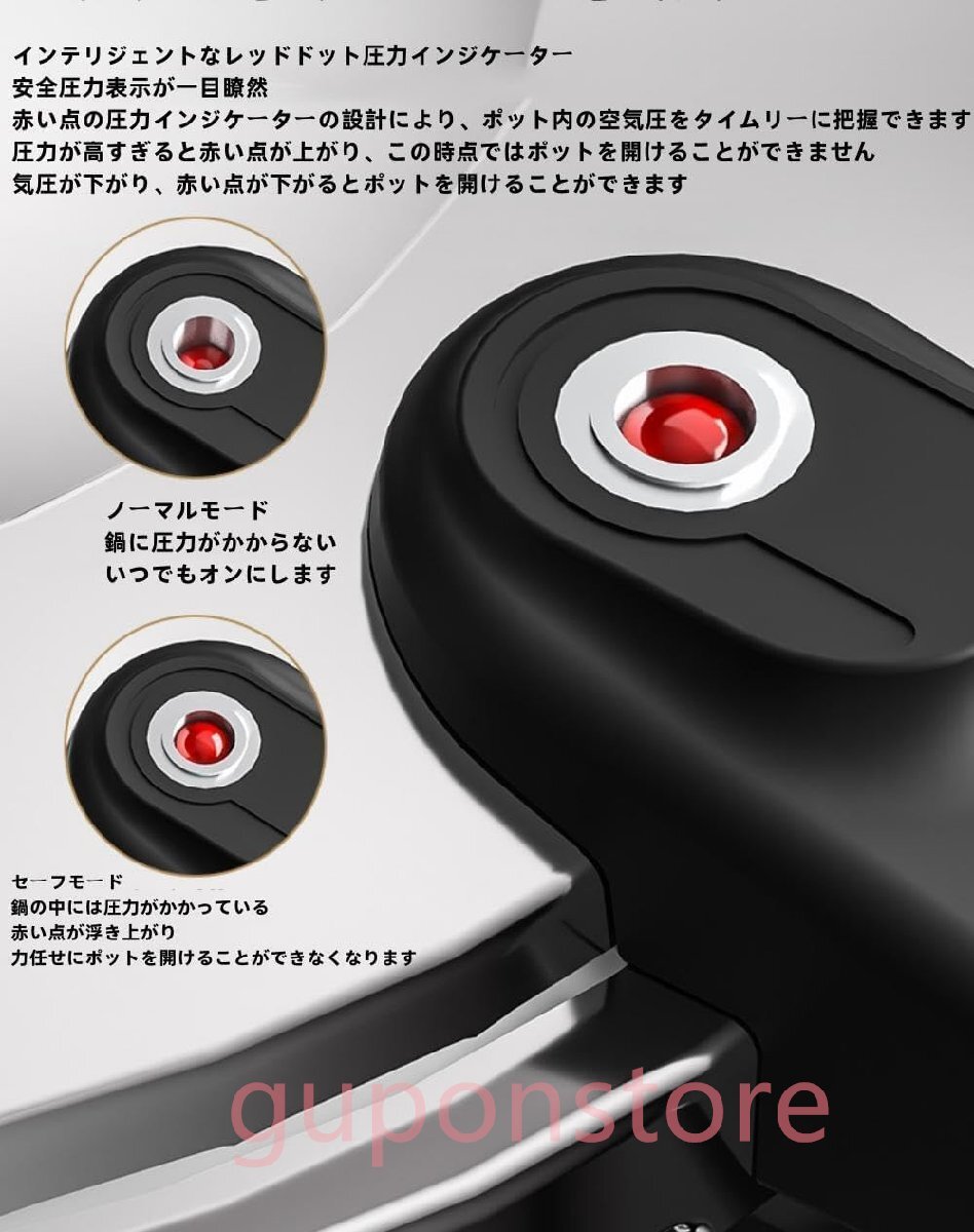 【安心設計】圧力調整装置(ソーダ)、浮上安全装置、安全弁、排気弁の安全保護により、ポット内の圧力が限界を超えても安全範囲を確保できます。 弾性シリコンリングはより安全で、出血や吹き出物を防ぎます。