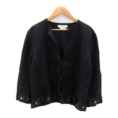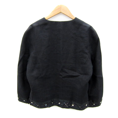 ザラウーマン ZARA WOMAN ノーカラージャケット ミドル丈 七分袖 スパンコール装飾 リネン 麻 40 L 黒 ブラック /SY30 レディース