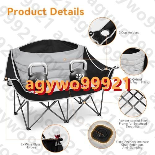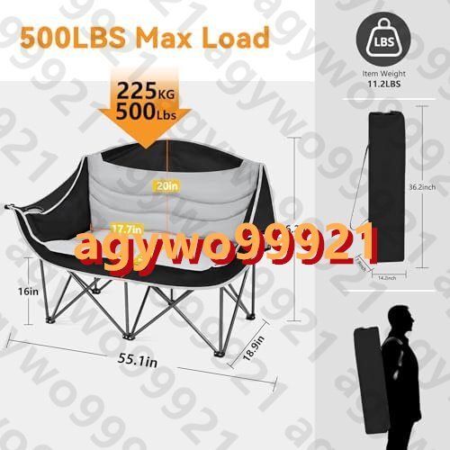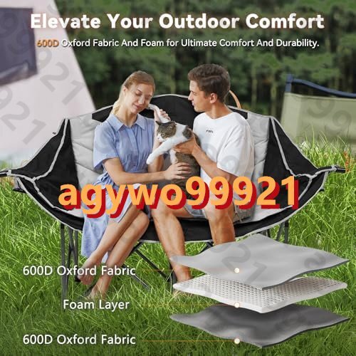 【信頼できる快適さ】みんなでくつろげる空間を目指して設計されたシート。 600D オックスフォード生地とフォームパッドで作られた当社の 2 人用キャンプ チェアは、軽量で折りたたみ可能なデザインで、どこへでも簡単に持ち運び、設置でき、長時間の快適さを提供します。