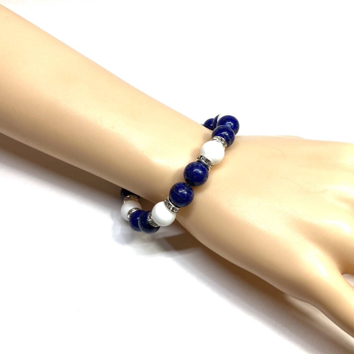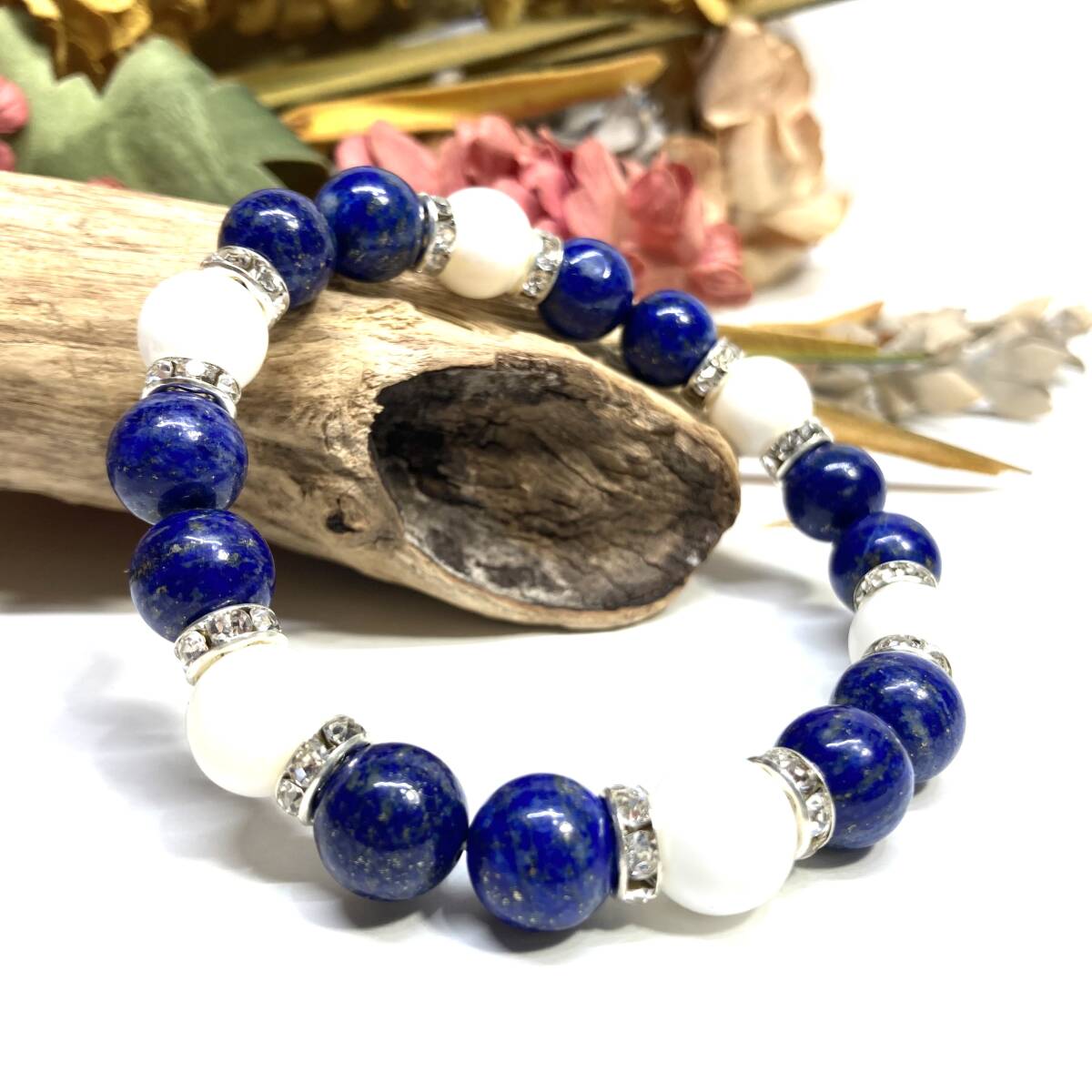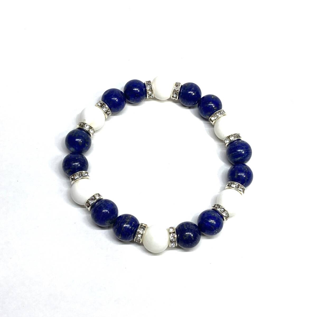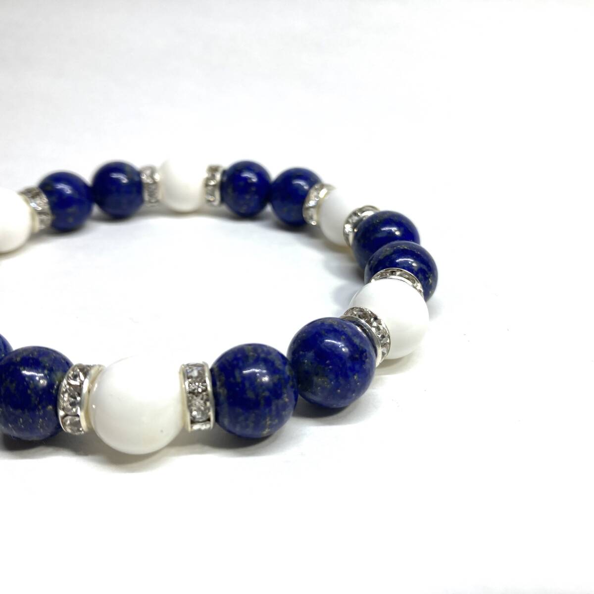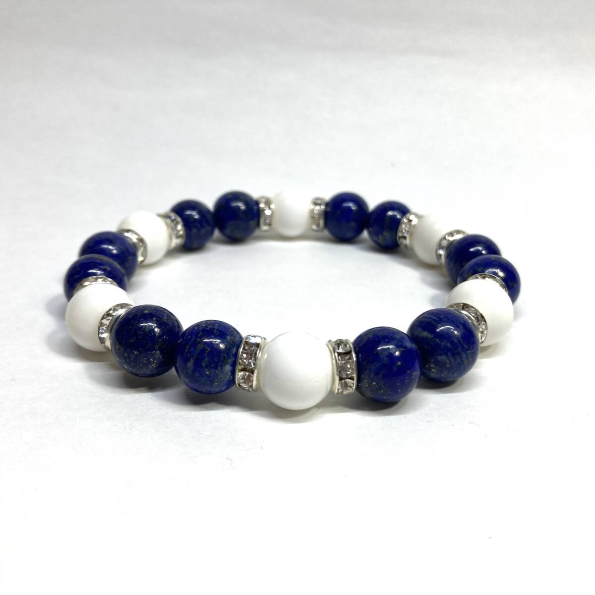 こちらは、ラピスラズリとホワイトオニキスを組み合わせたパワーストーンブレスレットです。間にはロンデルを挟み高級感あるデザインに仕上げております。石大きさは腕にも馴染みやすいように10mm玉で内径約18cm(伸可能)です。(サイズ変更の場合は取引ナビにてご連絡をお願いします。) 数に限りがございますので気になる方はお早めにどうぞ。