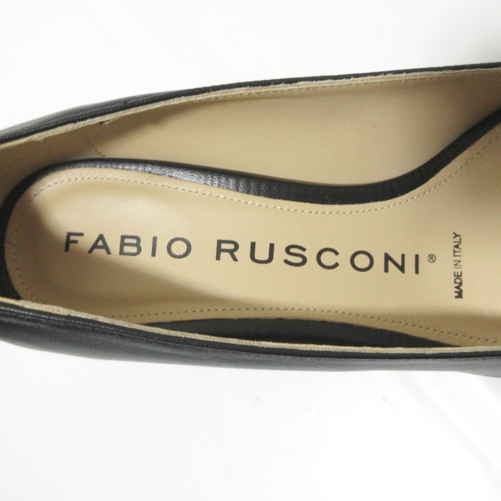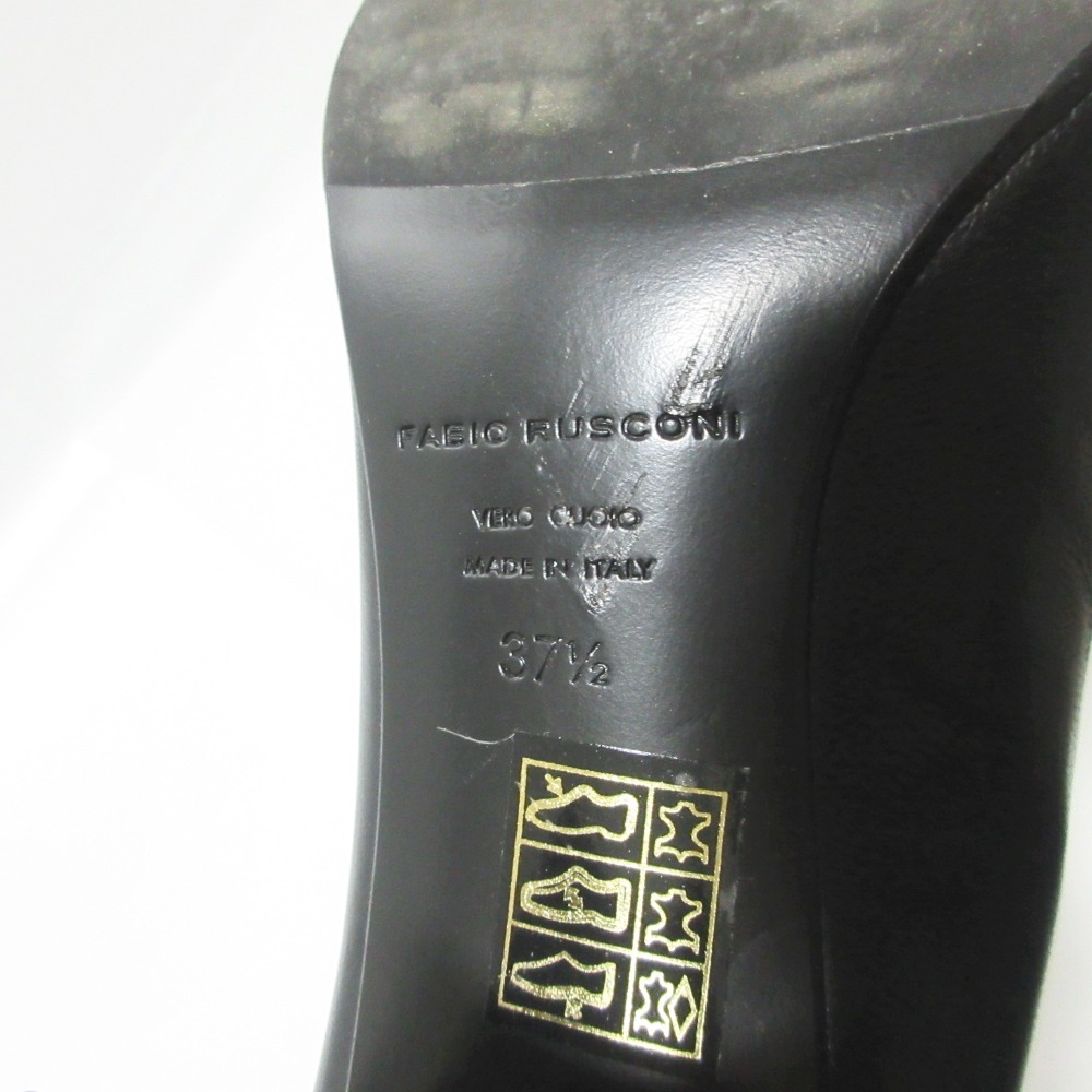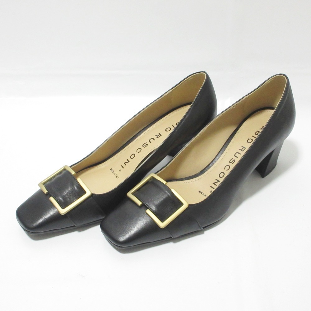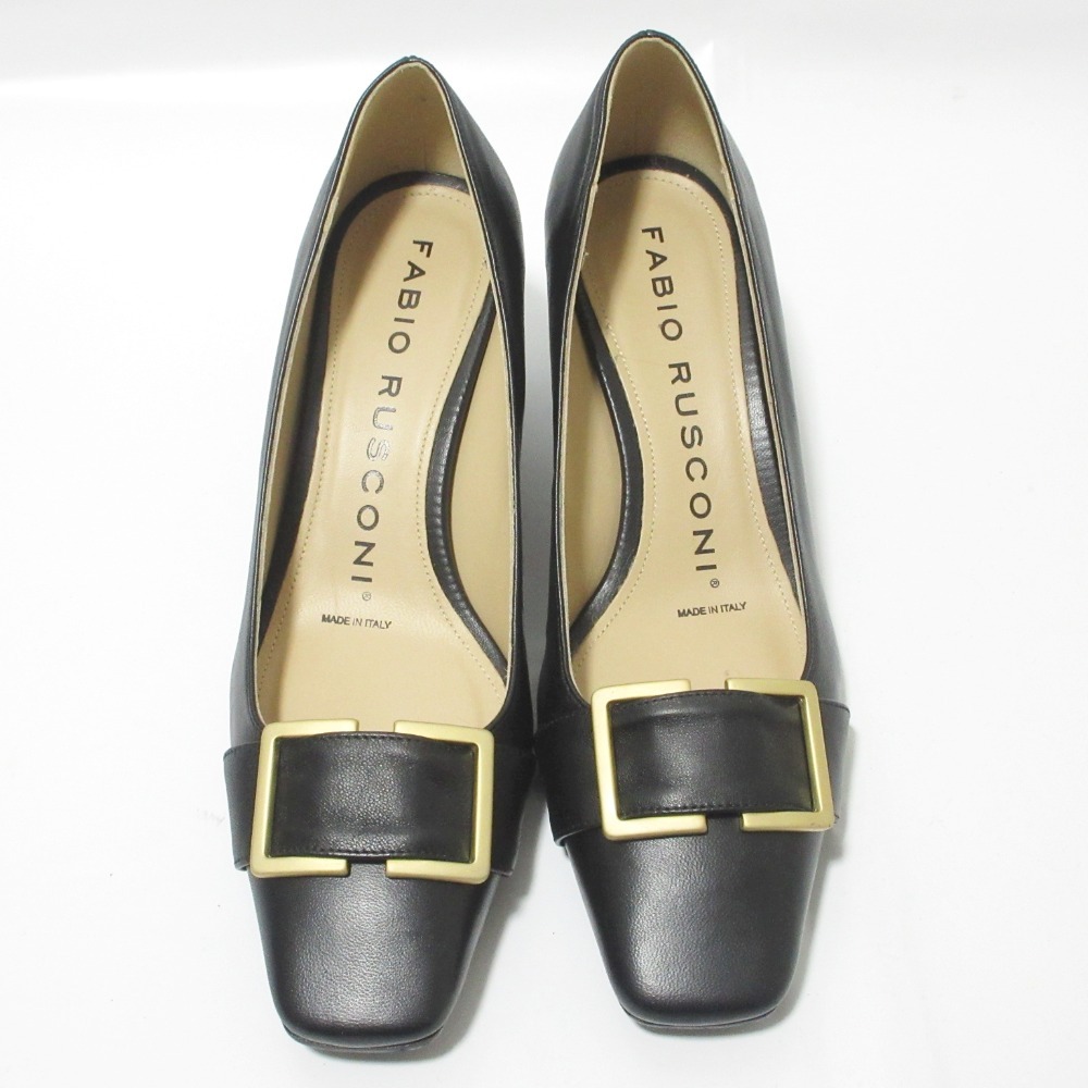 美品 FABIO RUSCONI ファビオルスコーニ レザー メタルバックル スクエアトゥ チャンキーヒール パンプス 37.5 約24cm ブラック
