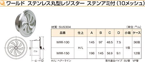 「水上金属 ワールド SUS304ステンレス 丸型レジスターφ150mm アミ付(10メッシュ) H/L(ヘアーライン)クリアー WRR-150」▼4515161029495▼(商品説明)-/-/WRR-150・パッケージ個数:1・製造国:中国取付適合パイプ:SU管 VP管