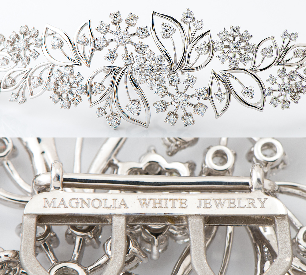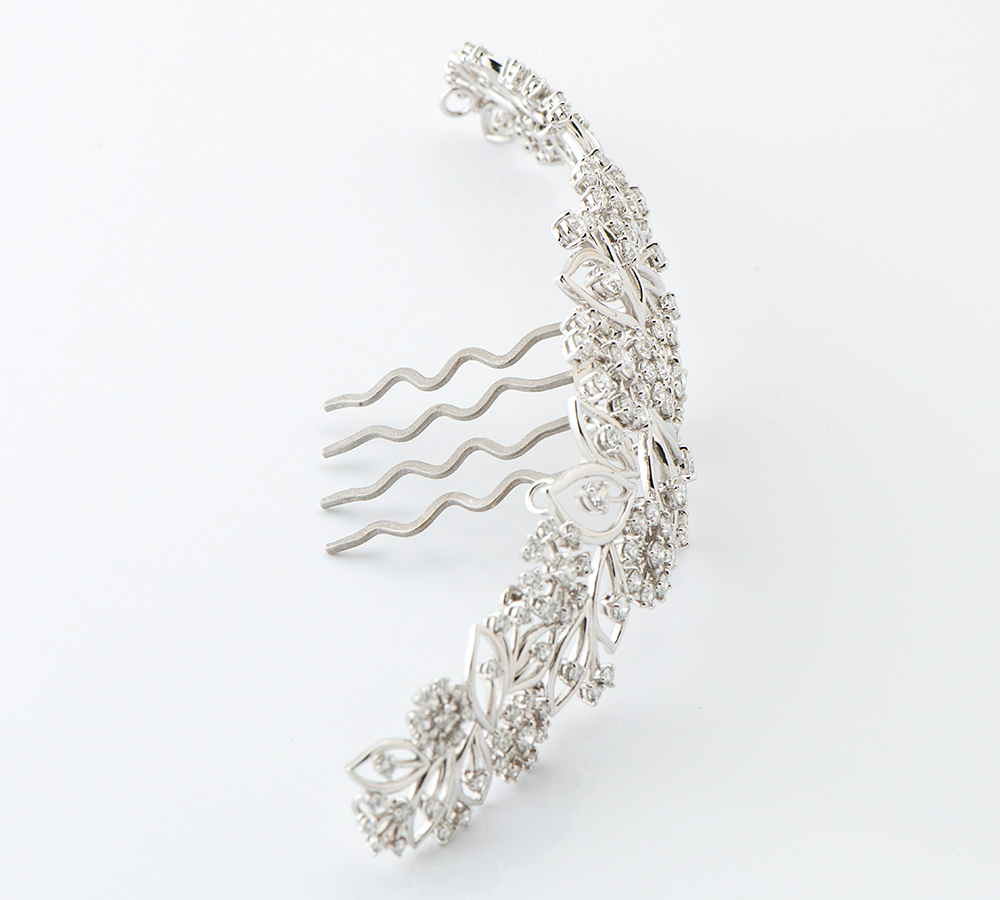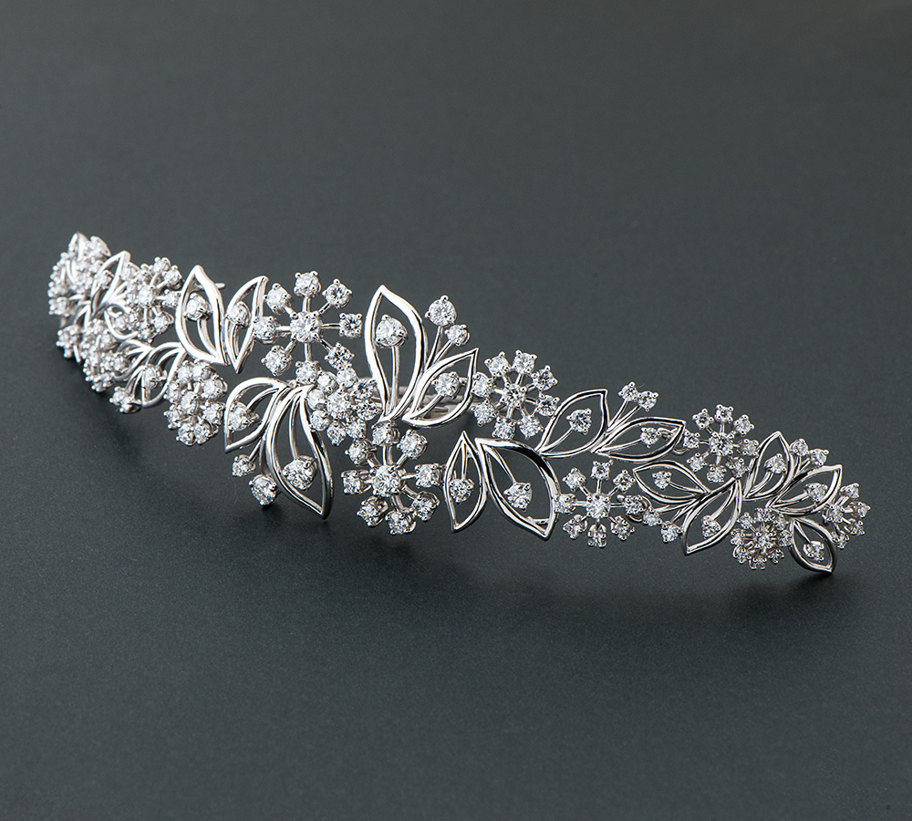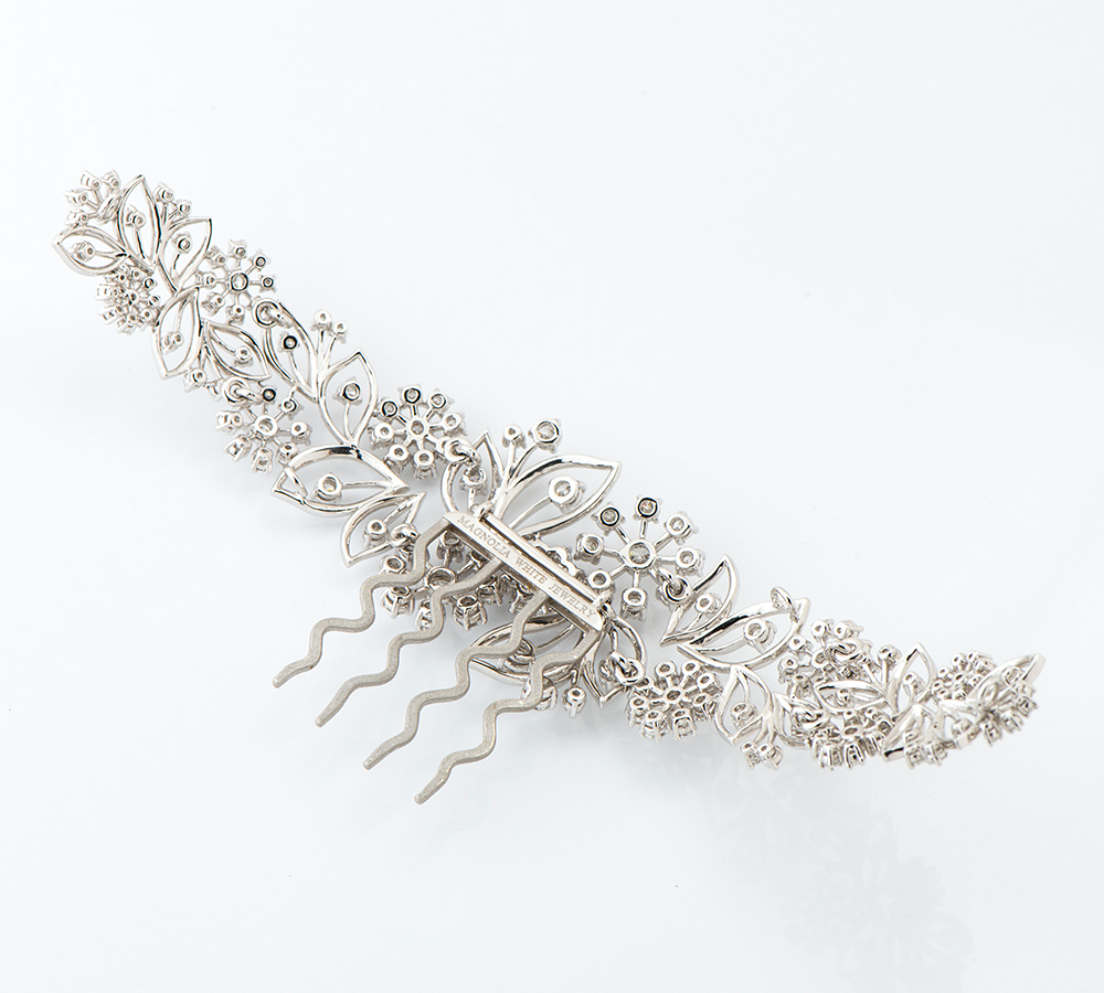インポートドレスを展開するMAGNOLIA WHITEのオリジナルジュエリーブランドとして2020年にスタートしたMAGNOLIA WHITE JEWELRY。一切妥協のない品質基準・価格・品質・仕立てにこだわり抜いたジュエリーを世に送り出しています。贅を尽くした極上のティアラ「Rania」は、アンティークジュエリーの中でも大変人気のある18世紀に流行したデザイン、リトルガーデンという意味の「ジャルディネッティ」を彷彿とさせるボタニカルなデザイン。純白の輝き「MAGNOLIA WHITE」と称する最も輝く条件を満たしたダイヤモンド合計11.225ctの美しさには圧倒されるほど。コンパクトに収納することもできるつくりで、ティアラスタイル、ヘッドバンドスタイルと様々なアレンジができるラグジュアリーでエレガントなハイジュエリーです。※販売価格の10%にてレンタル(有償貸出)も可能です。ご希望の方はご注文前にお問い合わせフォームからご連絡下さい。