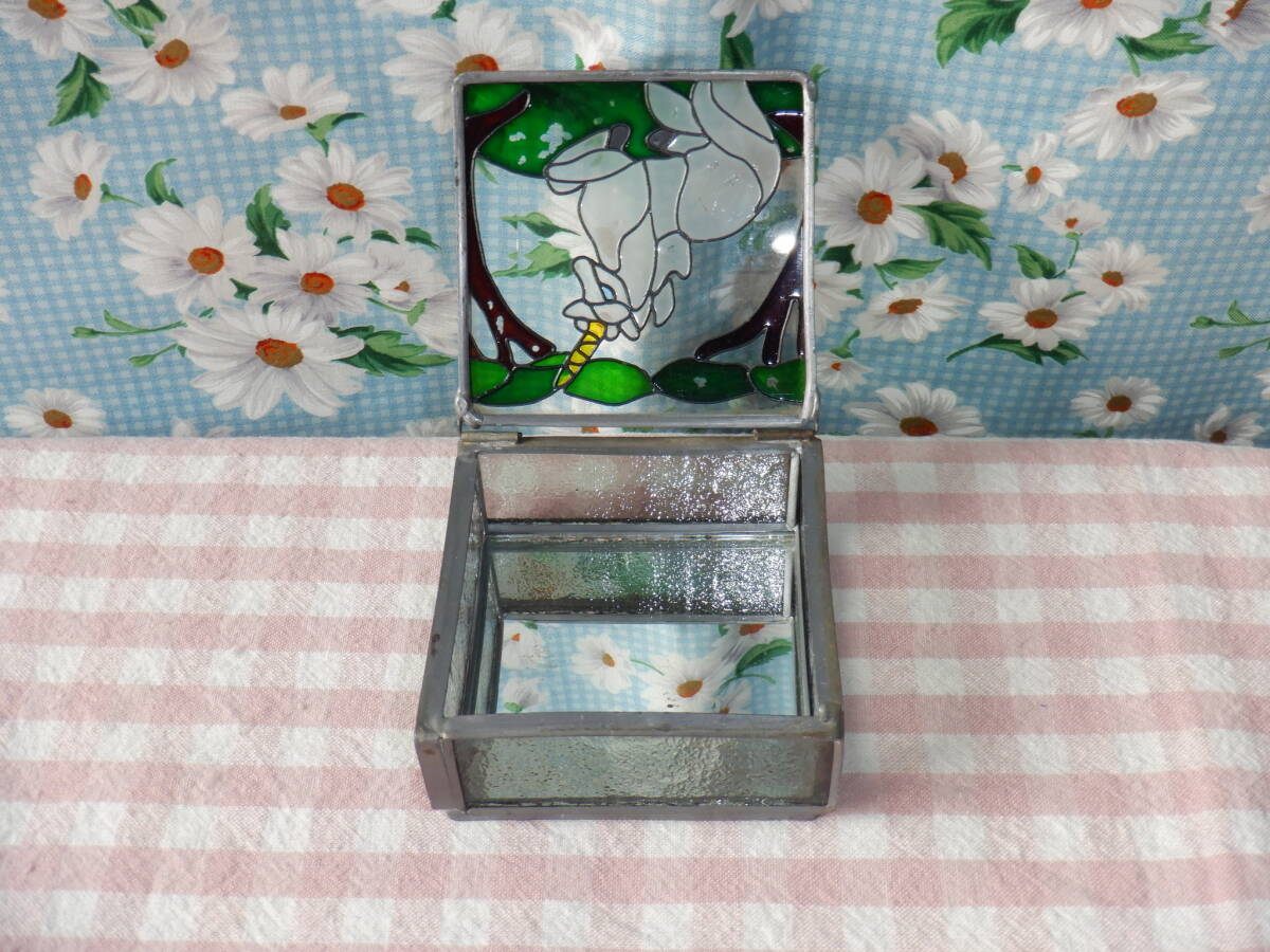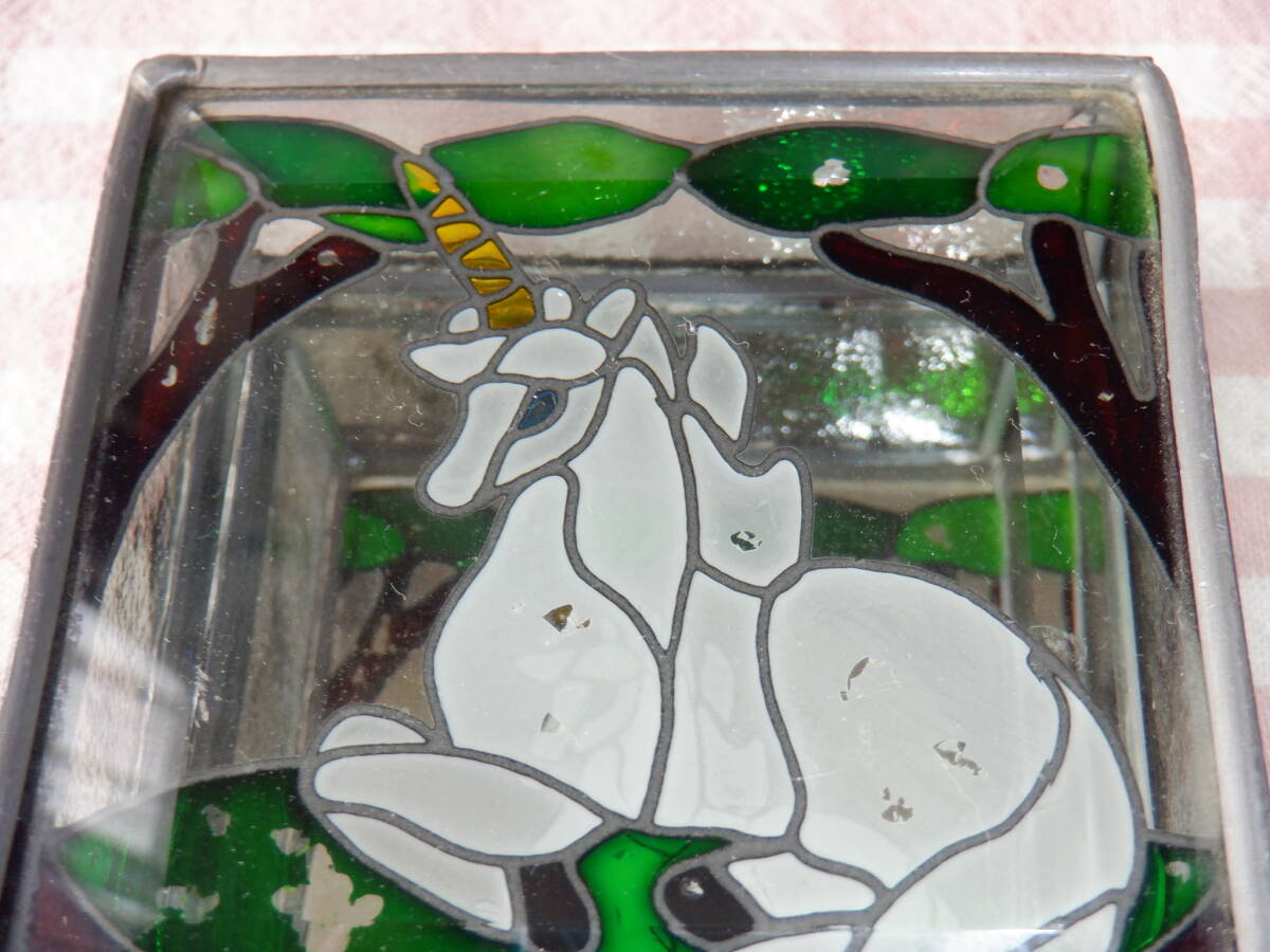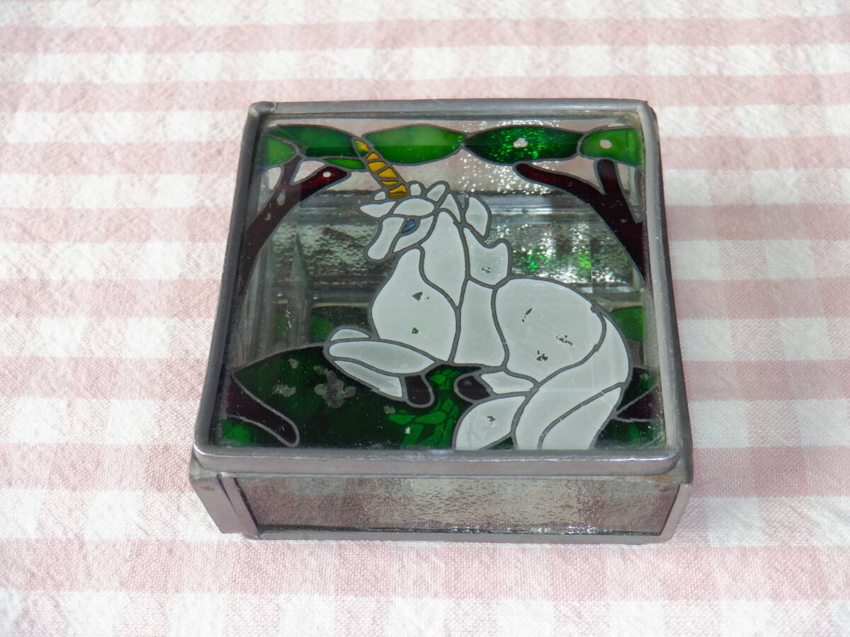 『ステンドグラス風 ユニコーンデザインのガラス製小物入れ 中古』~箱なしになります。小物入れのサイズですが、縦8cm、横幅8cm、高さ3.8cmになります。採寸の方ですが、多少の誤差はお許し下さい。実家の片付けで出てきましたので、長期保管品につき現状渡しとなります。ノークレームノーリターンでお願いいたします。神経質な方は、入札をご遠慮ください。新規の方、評価の悪い方の入札は、こちらの判断で取り消しさせていただく場合があります。