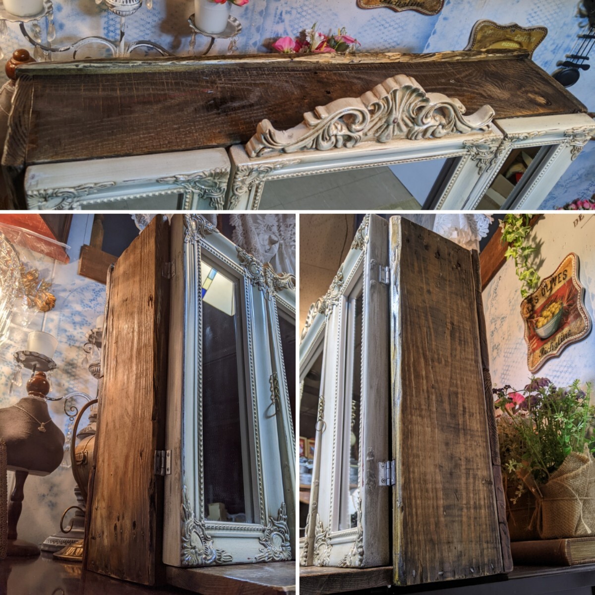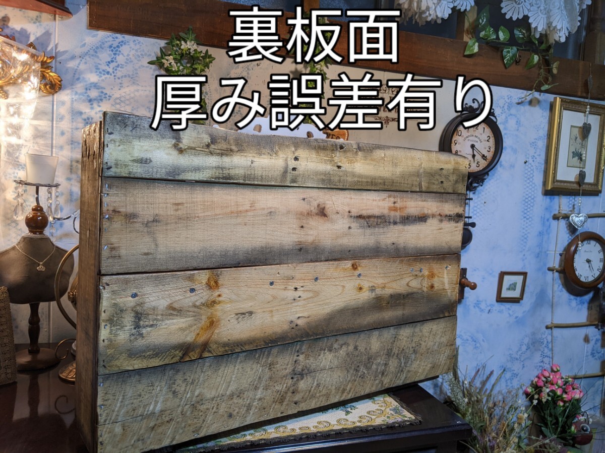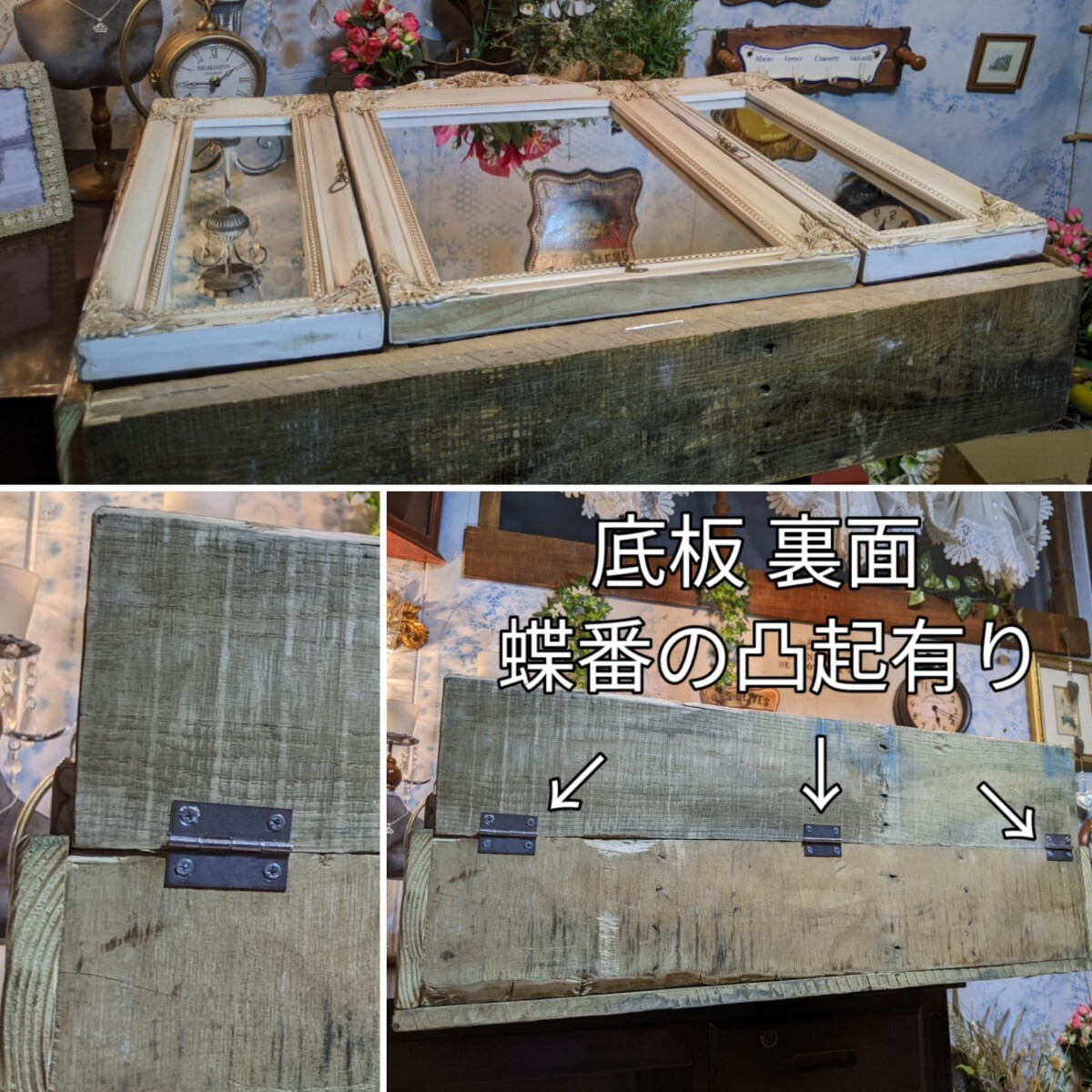 ■三面鏡のサイズに合わせ、ボックスを制作しており、アンティークな雰囲気に合わせ、古木を釘打ちで固定し、釘曲がり釘跡が有り、背板に隙間等を演出して仕上げております。