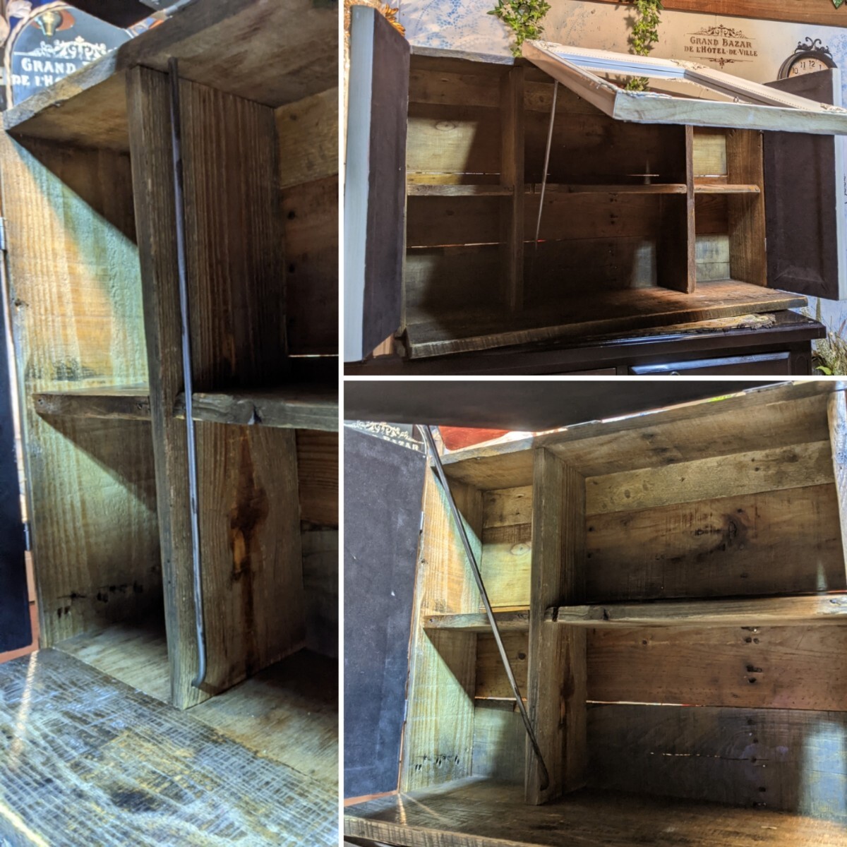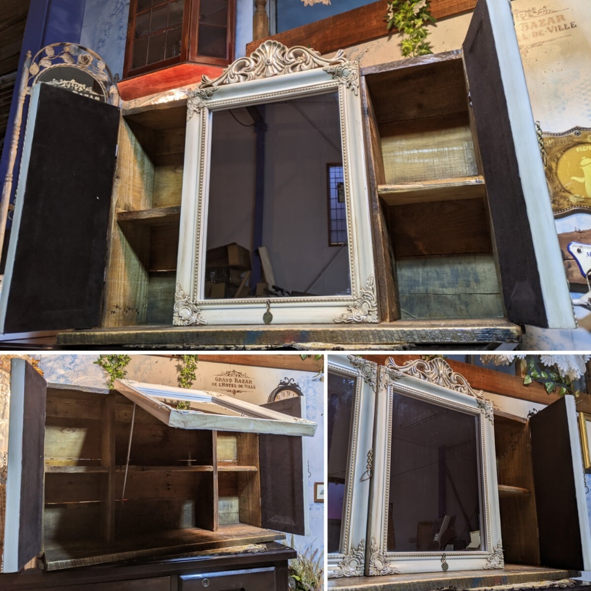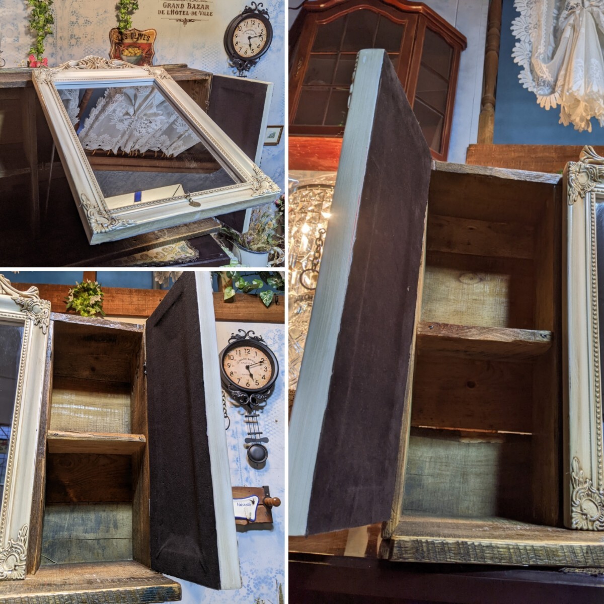 ■三面鏡のサイズに合わせ、ボックスを制作しており、アンティークな雰囲気に合わせ、古木を釘打ちで固定し、釘曲がり釘跡が有り、背板に隙間等を演出して仕上げております。