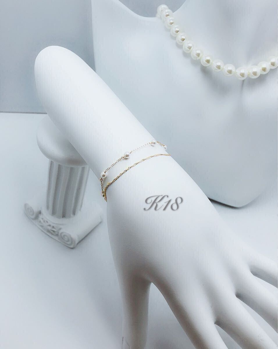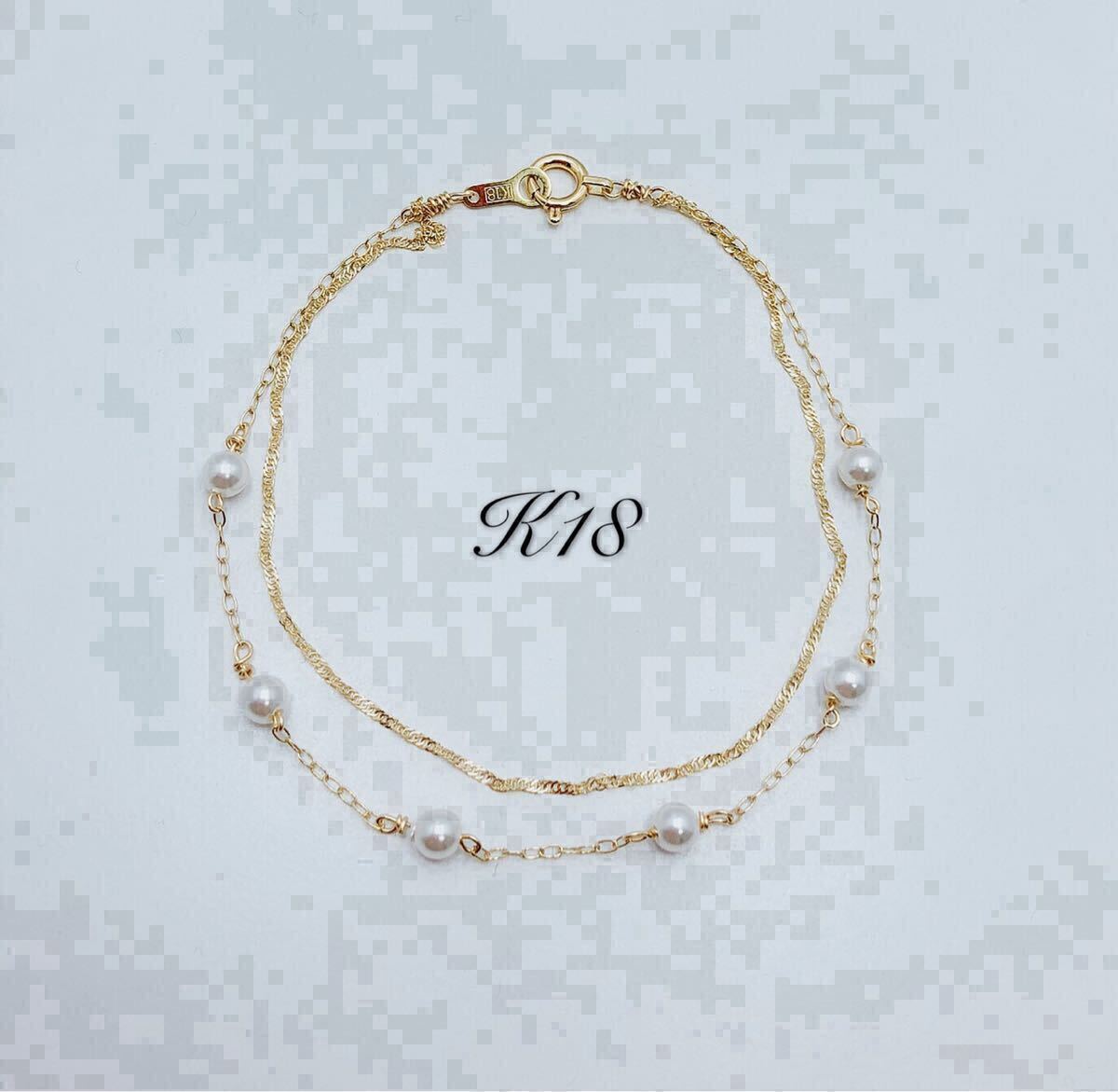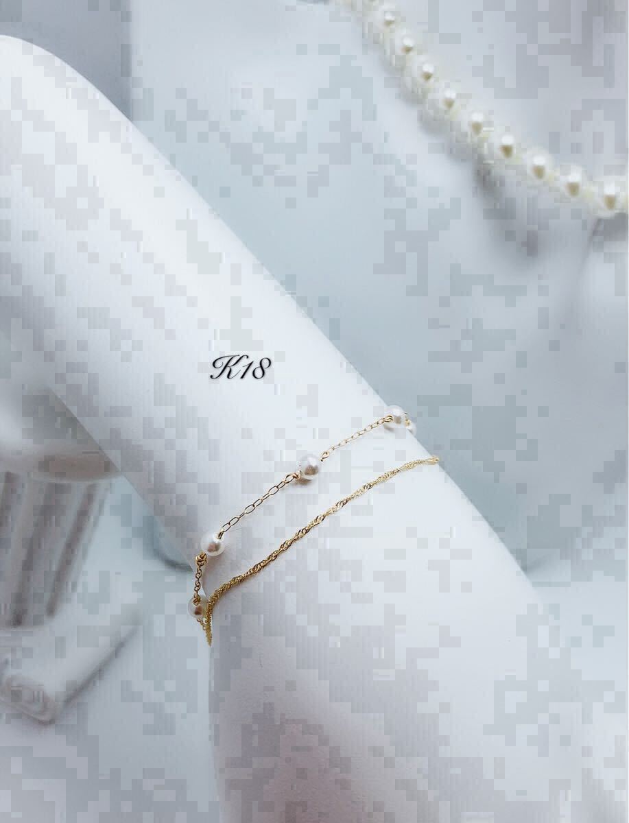 k18 18金 25cm ブレスレット ステーションブレスレット 小豆チェーン1mm アンクレット スクリューチェーン0.9mm 淡水パール3mm 2連