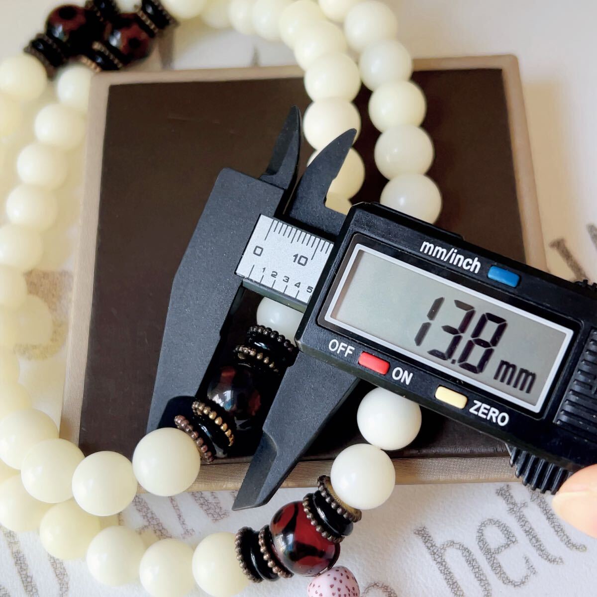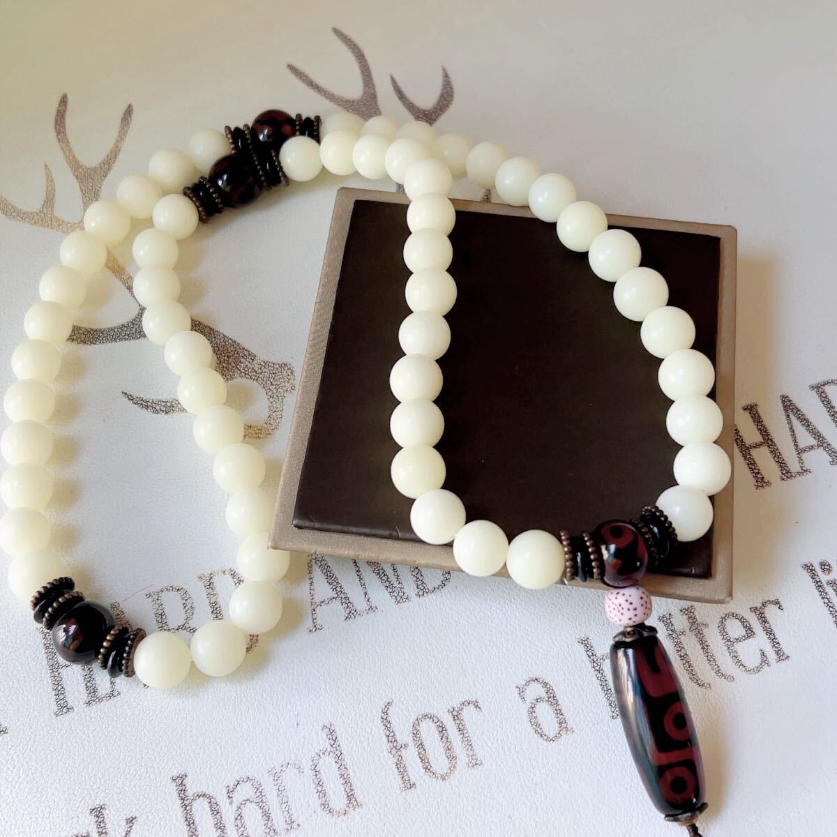 白い玉は、聖なるパワーが備わり、マイナスエネルギーを浄化する艶のある象牙質の実、「菩提根」。 菩提根は約700年前にインドとミャンマーより中国に来た物です。 貝多羅樹(ばいたらじゅ)の実の皮を剥ぐと、艶のある象牙質の実が出てくるのですが、使っているうちに茶色い飴色に変化し、その様が菩提樹の木の根を連想させることから「菩提根」と名付けられました。 木の寿命は60~70年と言われていますが、「菩提根」は、その命の終わる一番最後にただ一度だけ実をつけます。