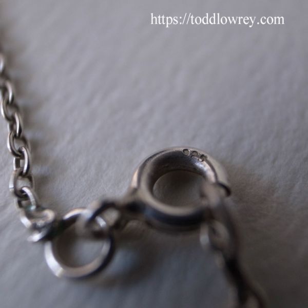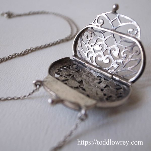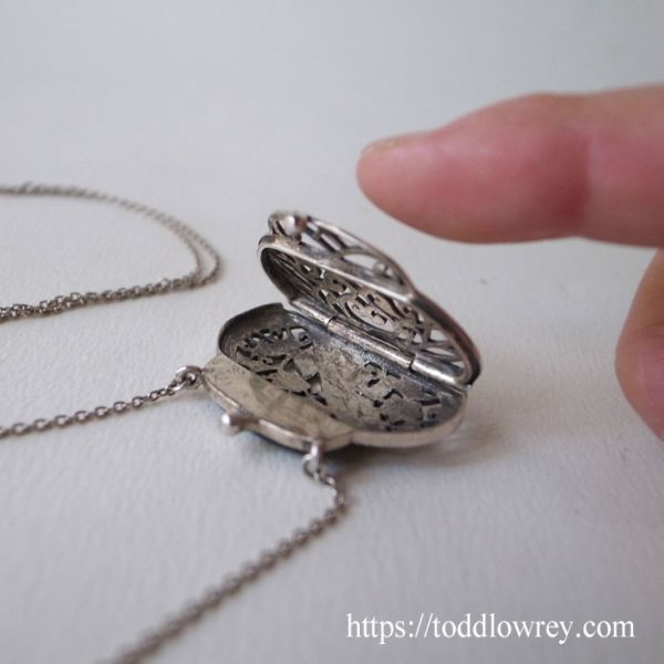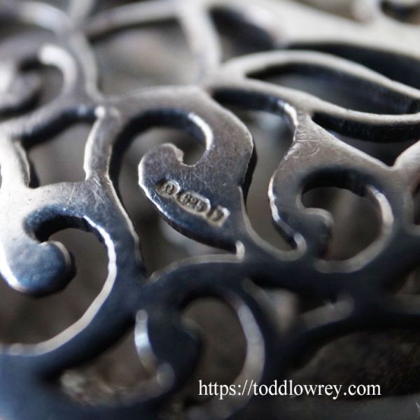 英国南部の競馬場で行われていたアンティークフェアで手に入れたペンダントのご紹介です。 比較的ロンドンから近いせいか、とても賑やかで、家具などの大物をはじめアクセサリー類も充実したフェアは時間が合えばぜひ訪れたい場所です。ストールも多く、一生懸命回るとヘロヘロになりお腹がすきますが、サンドイッチもコーヒーも田舎に比べればロンドン価格でびっくりするので、可能ならばぜひお弁当を持っていくことをお勧めいたします。 そんな場所でカジュアルな服装の金髪のお姉さんから買い付けたペンダント。 珍しいのはなんといってもこのデザイン。小さな小さなバッグの形をしていて、きちんと開閉するのが特徴です。バッグはアールデコ調の飾りが施されていて、シルバーをベースにマーカサイトが効果的に配されています。口金部分にはポイントでオニキスが入っているのもニクイ演出。 背面はシルバーの透かし彫り。小さいので1円玉はもちろん1ペニー硬貨すら入りませんが、例えばポプリを入れたり、小さな布にアロマオイルを染みこませて秘かに香りを楽しむことはできそうです。ロケット代わりに大切な人の写真をいれるのもよろしいかもしれません。 背面には「925」の刻印、隣には「Ω」の刻印。この「Ω」は、1975年以降の輸入品で、輸入後にシェフィールドのアセイオフィスで認可を受けた印となります。産地は不明ですが、何となくイタリアあたりかな、と推測いたします。「925」の右側にもデイトレターらしき刻印や、少し離れた場所にも刻印があるのですが、小さすぎて判読はできませんでした。 アクセサリーなどに、特に何を入れるのでもないのに、収納部があると何故か嬉しくなってしまうのは私だけでしょうか。時に意味もなく開閉してみたり、入れられるものを探してみたり。 優雅で小粋なデザインに、ちょっとしたお愉しみがついてくるヴィンテージアクセサリー。 貴方の装いのワンポイントにいかがでしょうか。 ◆England買付 ◆推定製造年代:c.1975年以降 ◆素材:スターリングシルバー(シルバー925)、オニキス ◆バッグのみのサイズ:高さ約2.7cm 幅約3.5cm 厚み約0.6cm ◆ペンダント全長:約66cm ◆総重量:15g ◆在庫数:1点のみ 【NOTE】 *古いお品物ですので、一部に小傷や汚れ、錆びや変色、ゆがみなどがみられます。 *留め具はきちんと動作します。 *チェーンには途中で大きめの丸環があり、通常は2つの長さにできるものかと思いますが、取り付け方を間違えたのか特に機能しません。 *詳細は画像にてご確認ください。 *画像の備品は付属しません。 *上記ご了承の上、お求めください。 |