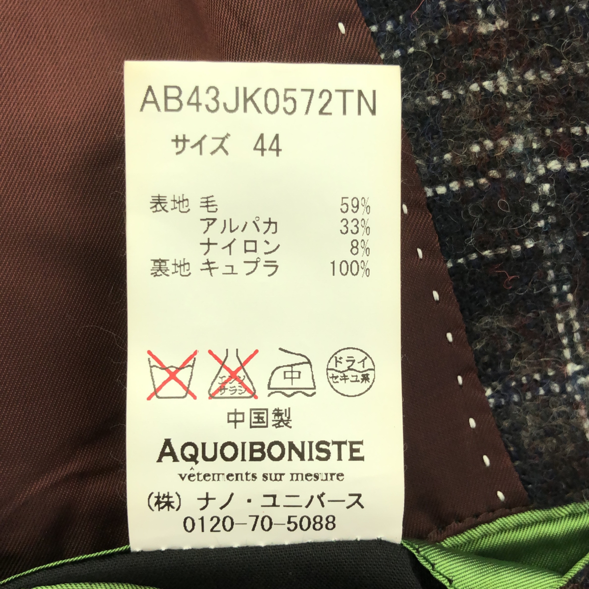 | 商品名 | AQUOIBONISTE アクワボニスト FERLA フェルラ アルパカ混 チェック柄 テーラードジャケット ブレザー |