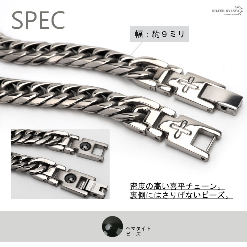 チタン素材を使用したダブル喜平チェーンネックレス。密度が高く、シンプルで使い勝手の良い便利なアイテム。留具に並ぶ、ヘマタイトビーズがさりげないお洒落を演出。