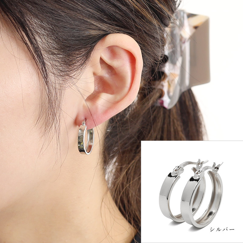 装飾のないシンプルなデザインが大人っぽさを演出するフープピアス。表面のツヤっとしたテクスチャも魅力です。