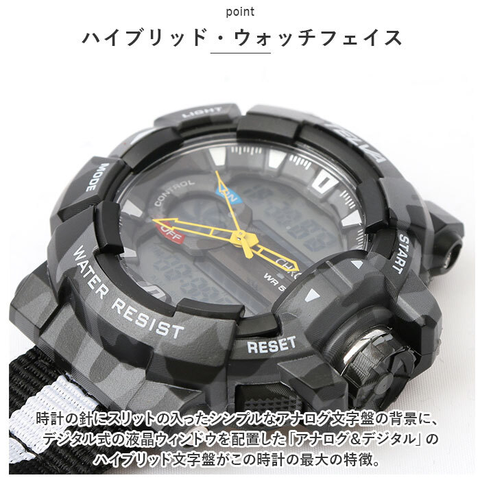 | 商品説明 | ・・ワイルドなカモフラージュ&スポーティーなバイカラーデザイン!「TELVA -テルバ- アナデジ ハンギングウォッチ」が新登場。 ・【ユニークなハンギングウォッチ】 ・ベルトに付いたカラビナフックで、リュックのループやベルト通しなどに引っ掛けて使える、お洒落なハンギングウォッチ。 ・【ハイブリッド・ウォッチフェイス】 ・時計の針にスリットの入ったシンプルなアナログ文字盤の背景に、デジタル式の液晶ウィンドウを配置した「アナログ&デジタル」のハイブリッド文字盤を採用。 ・【コンパクトな液晶ウィンドウ】 ・液晶ウィンドウ上段には「月・日・曜日」のカレンダー。下段には「時・分・秒」まできちんと読み取れるデジタル時計を配置し、コンパクトながらも時間が読みやすいシンプルデザイン。 ・【機能切り替えスイッチで簡単操作】 ・文字盤フレーム外側の「LIGHT」「MODE」「RESET」「START」の4つのボタンで、「時刻設定」「アラーム設定」「ストップウォッチ機能」など、様々な機能を簡単操作! ・【アラーム設定機能】 ・文字盤左下の「MODE」ボタンを2回押すと、アラーム時刻設定モードが起動。お仕事中のタスク管理や、毎朝のお目覚め時刻もラクラク設定。 ・【ストップウォッチ機能】 ・スポーツやアウトドアシーンに便利なストップウォッチ機能も搭載!「MODE」ボタンを1回押して、「通常計測」と「スプリットタイム計測」、2つのストップウォッチ機能を使いこなすことが可能。 ・【バックライト機能付き】 ・文字盤左上の「LIGHT」ボタンを押すと、液晶画面のELライトが点灯。消灯後のお部屋や、夜間のアウトドアでもパッと時刻が確認できる! ・【日常生活用防水機能】 ・水周りでのお仕事や手洗いのとき、屋外で突然雨に降られても安心して使うことのできる日常生活用防水機能付き(5気圧防水)。(※完全防水仕様ではありません。) ・【さまざまな場面で大活躍】 ・手元の作業を妨げないハンギングスタイルなので、医療現場で働く方や腕時計をつけられないお仕事の方、腕時計の金属部分が肌に直接触れるのが心配な敏感肌の方にもピッタリ。 |