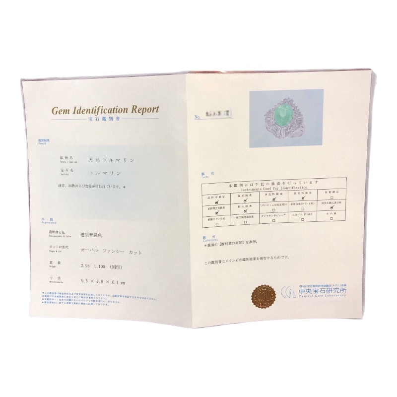 石目 | パライバトルマリン(2.98ct) 、ダイヤモンド(1.1ct) | ||